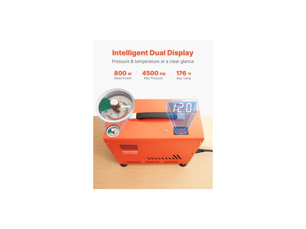 Způsob chlazení: Efektivní chladicí ventilátor, Jmenovitý výkon: 800 W, Maximální teplota: 176 ℉ / 80 ℃, Rozměry výrobku: 14,6 x 7,1 x 13,8 palce / 370 x 180 x 350 mm, Typ zastavení: Automatické zastavení, Čistá hmotnost: 33,5 lbs / 15,2 kg, Maximální tlak: 4500PSI / 30Mpa