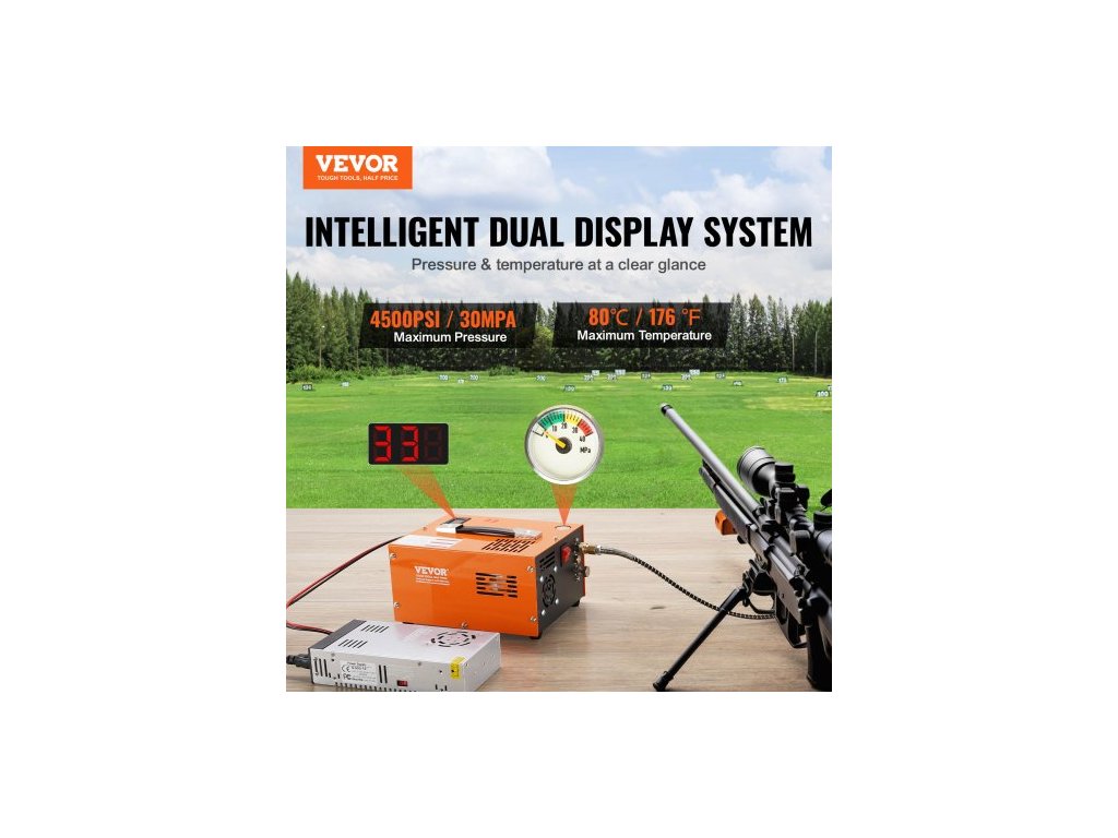 Vzduchový kompresor PCP, přenosný kompresor PCP s externím měničem 4500 PSI/30 MPa, DC12V, AC230V | Bez oleje a vody | Kompresorové čerpadlo s manuálním zastavením pro vzduchovku, paintball a potápěčskou lahevInteligentní duální displej