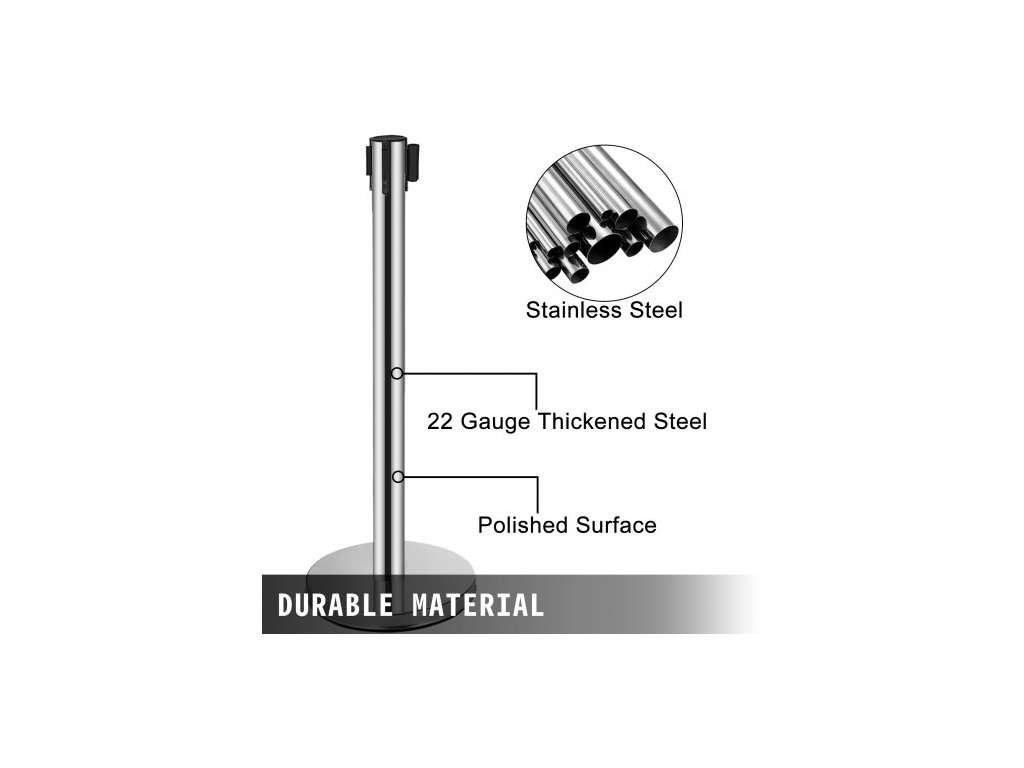 zábrana proti davu, sada 6 kusů, sloupek pro regulaci davu z uhlíkové oceli s vypalovacím lakováním, frontový sloupek s 3CS zatahovacím pásem a plnitelnou základnou, dělicí přepážka pro pásovou zábranu, snadná montážOdolný materiál