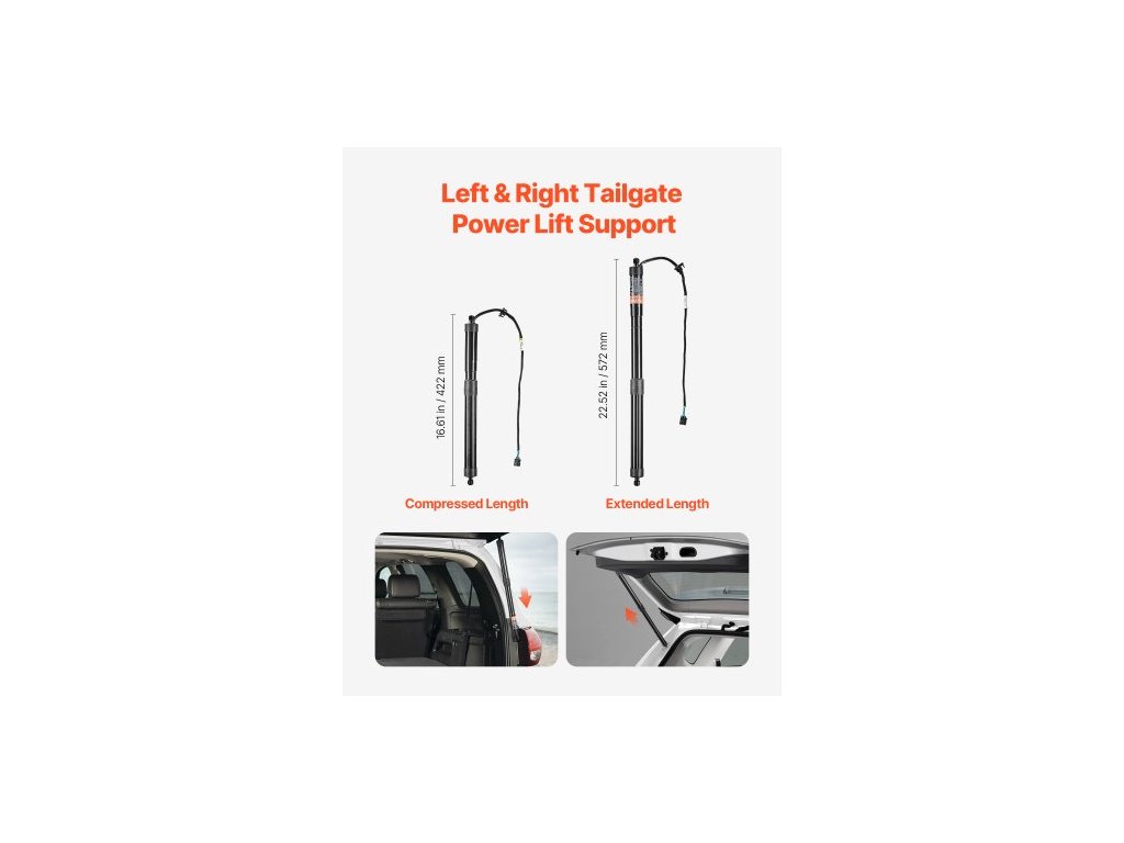 Číslo modelu položky: D1304,Množství: 2,Rozměry produktu: 23,31 x 1,38 x 1,38 palce / 592 x 35 x 35 mm,Čistá hmotnost: 5,67 lbs / 2,57 kg,Umístění na vozidle: Zadní elektricky ovládané vzpěry výklopných dveří (levé/pravé),Jmenovité napětí: DC 12 V