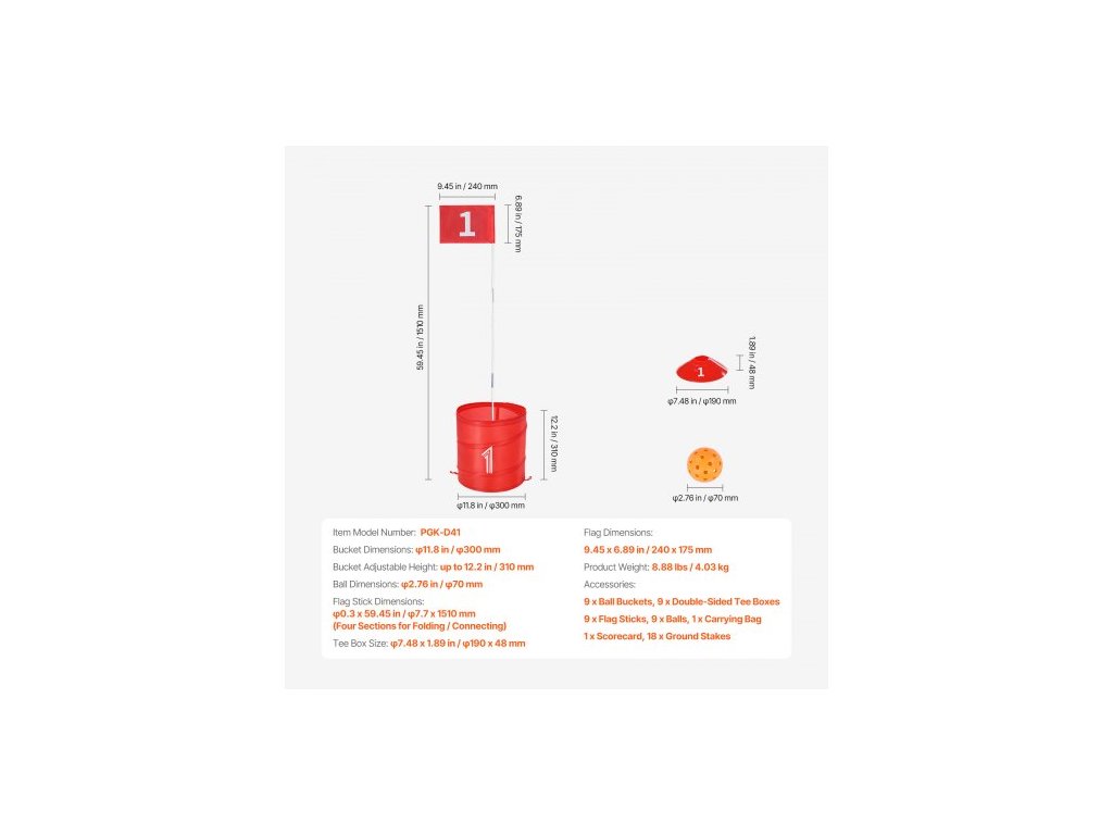 Rozměry míčku: φ2,76 palce / 70,00 mm, Nastavitelná výška kbelíku: až 12,20 palce / 310,00 mm, Číslo modelu položky: PGK-D41, Rozměry vlajky: 9,45 x 6,89 palce / 240,00 x 175,00 mm, Hmotnost výrobku: 8,88 lbs / 4,03 kg, Rozměry vlajkové tyče: φ0,30 x 59,45 palce / 7,70 x 1510,00 mm (čtyři sekce pro skládání / spojování),Rozměry lopaty: φ12,00 palců / φ300,00 mm,Rozměr T-kusu: φ7,48 x 1,89 palců / 190,00 x 48,00 mm