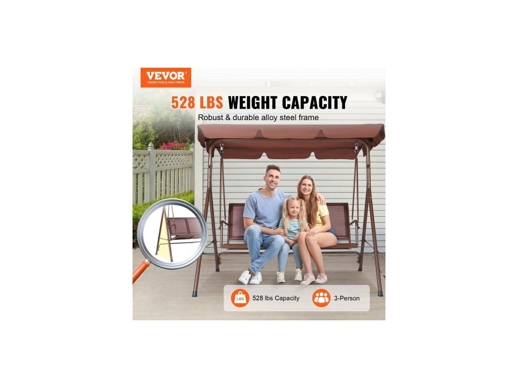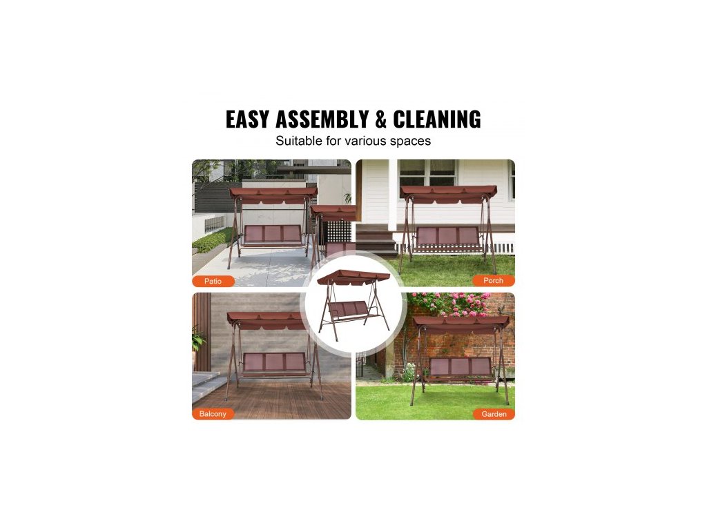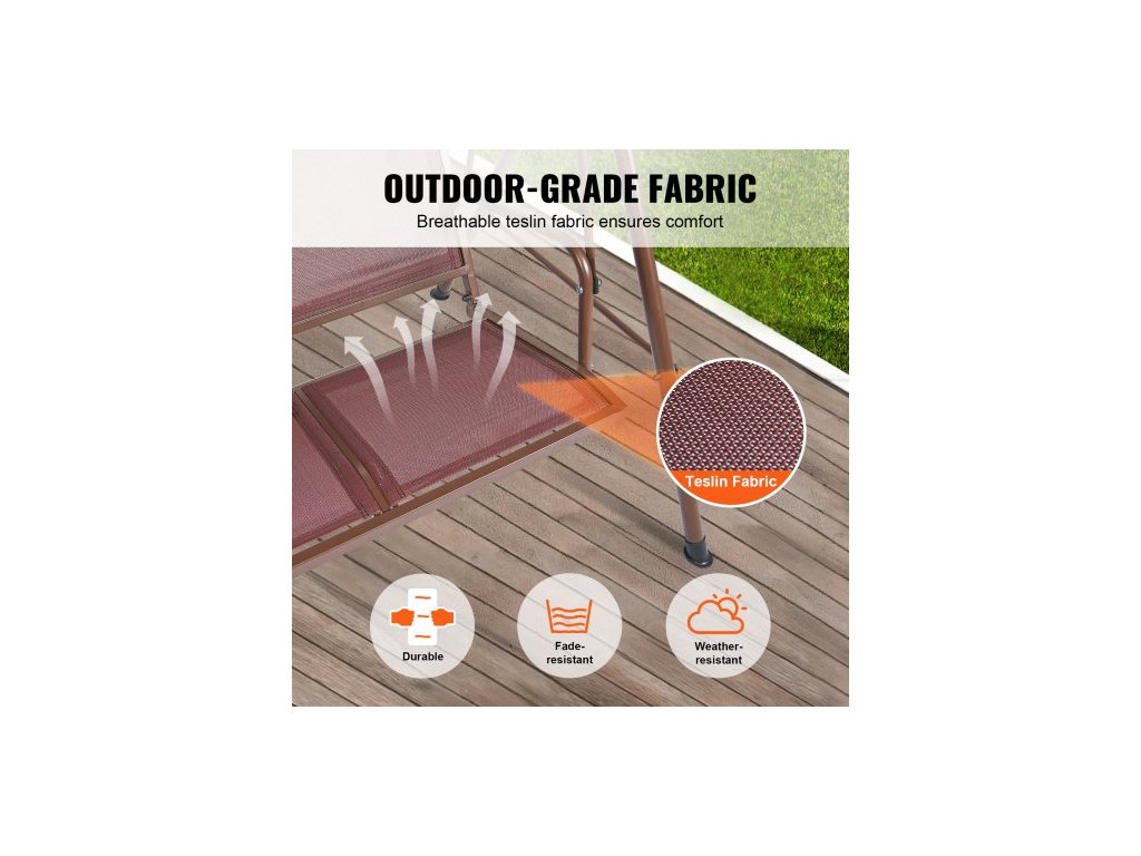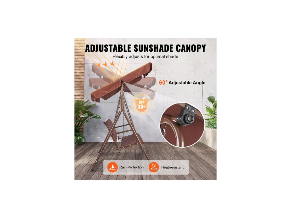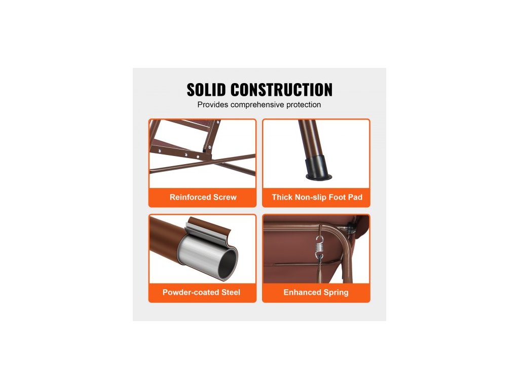 Šířka sedáku: 52 palců, Hloubka sedáku: 17 palců, Barva: Hnědá, Materiály: Práškově lakovaná ocelová trubka, polyesterová tkanina, oxfordská tkanina, Číslo modelu položky: SW007, Hmotnost výrobku: 44,3 libry/20,1 kg, Rozměry výrobku: 68,5"×43,1"×59,8"/1740×1095×1520 mm, Maximální hmotnost: 528 liber