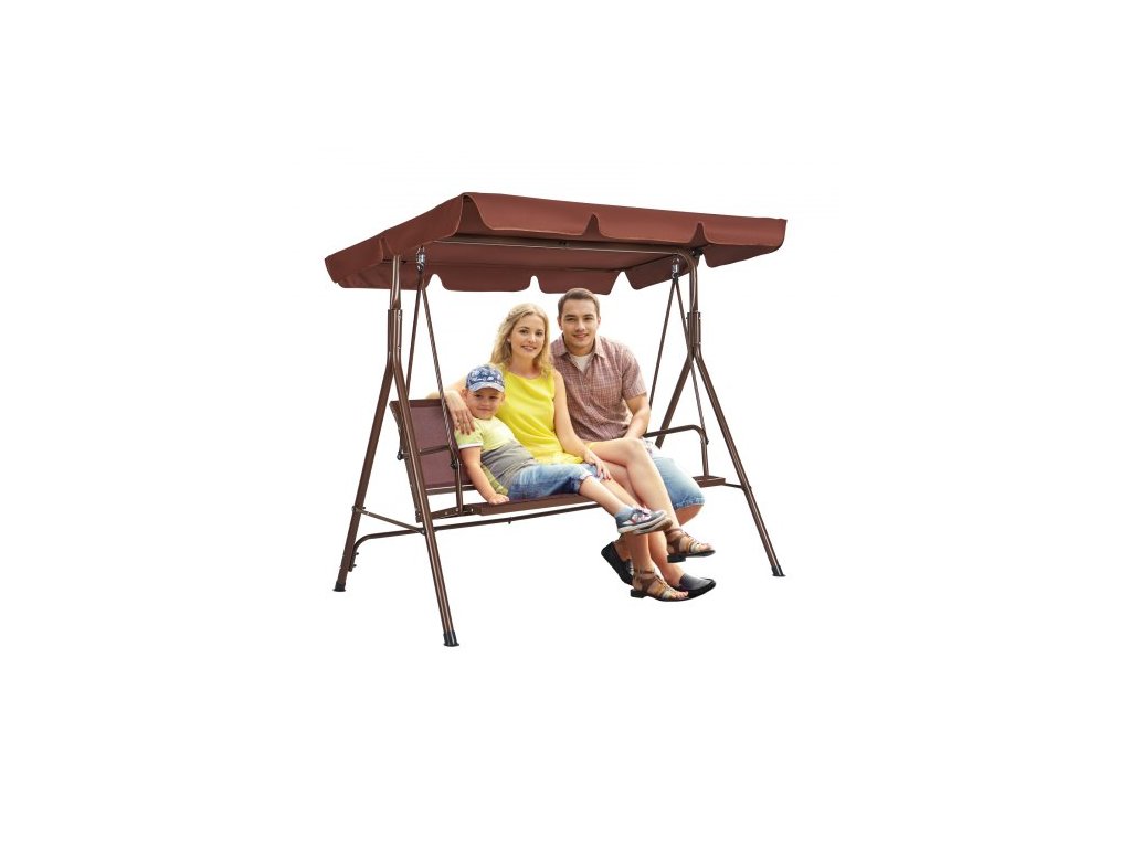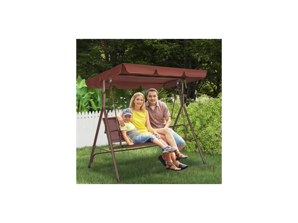 Zahradní houpací křeslo pro 3 osoby, venkovní zahradní houpačka s nastavitelnou stříškou, verandová houpačka s područkami, látka Teslin a rám z legované oceli, na balkon, dvůr, terasu, zahradu, k bazénu, hnědá