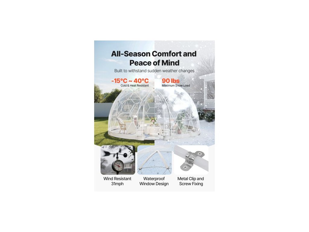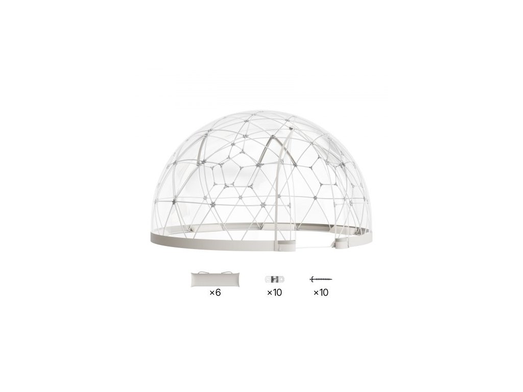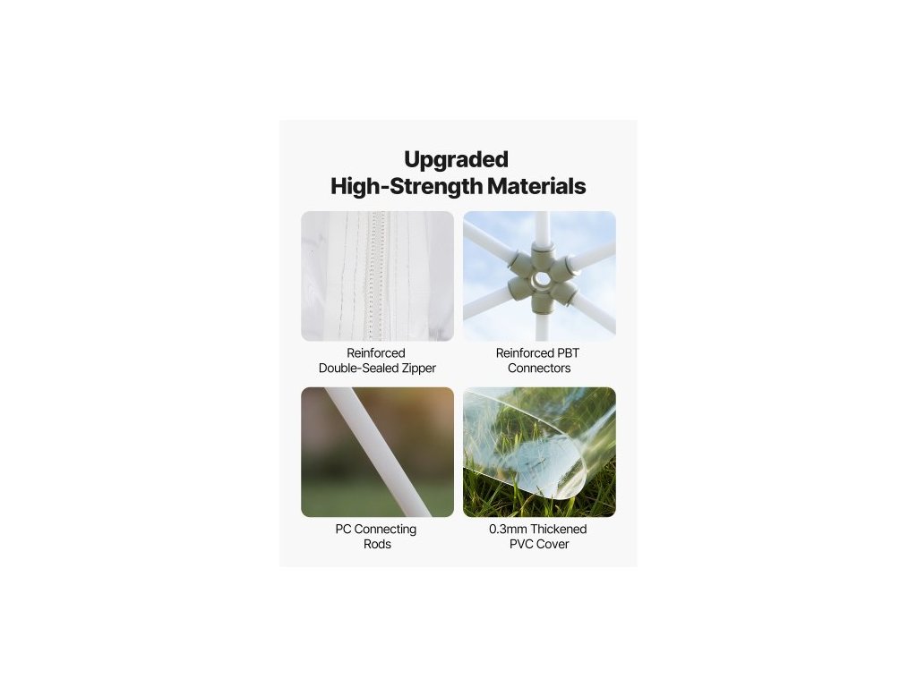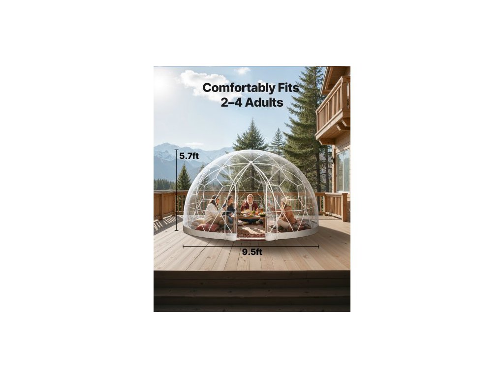 Rozměry: 9,5 stop,Barva: Bílá + průhledná,Materiál: PVC,Rozměry výrobku: 9,5 × 5,7 stop / 2900 × 1750 mm,Maximální odolnost proti větru: 31 mph,Maximální zatížení sněhem: 90 lbs,Hlavní materiály: PVC stříška, PC tyče, PBT konektory,Kapacita: 2-4 osoby,Číslo modelu položky: GB-DOME-9.5,Barva základní hrany: Bílá lišta,Konektor Typ: Plně rychlospojka, Výška: 1,7 m, Životnost: 1 rok, Čistá hmotnost: 17,55 kg (tolerance ±3 %, včetně veškerého příslušenství)