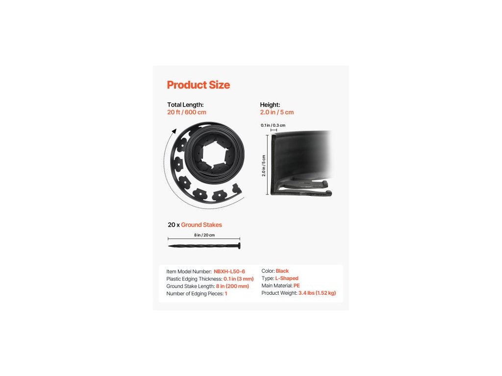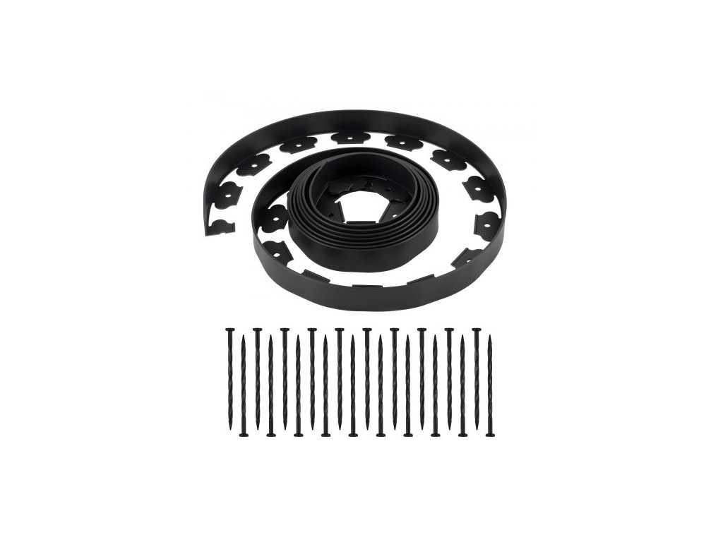 Rozměry plastové obruby: 600 × 5 cm,Typ: Tvar L,Počet kusů obruby: 1,Barva: Černá,Číslo modelu položky: NBXH-L50-6,Hmotnost výrobku: 1,52 kg,Délka zemního kolíku: 200 mm,Tloušťka plastové obruby: 3 mm,Hlavní materiál: PE