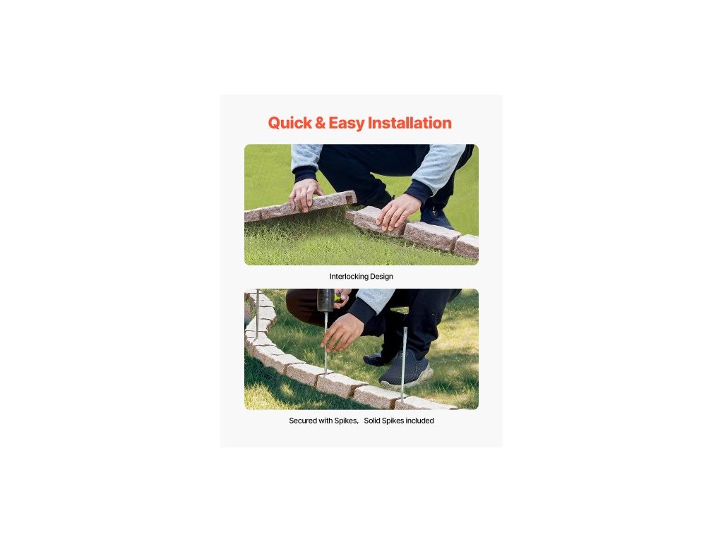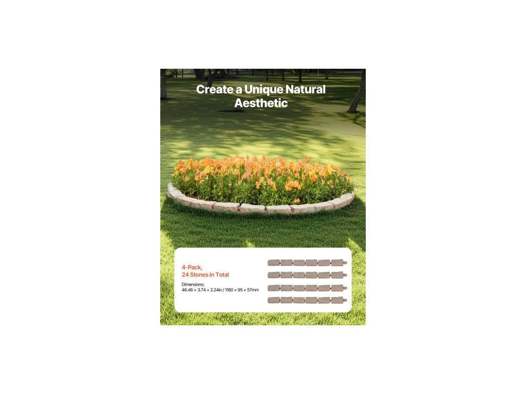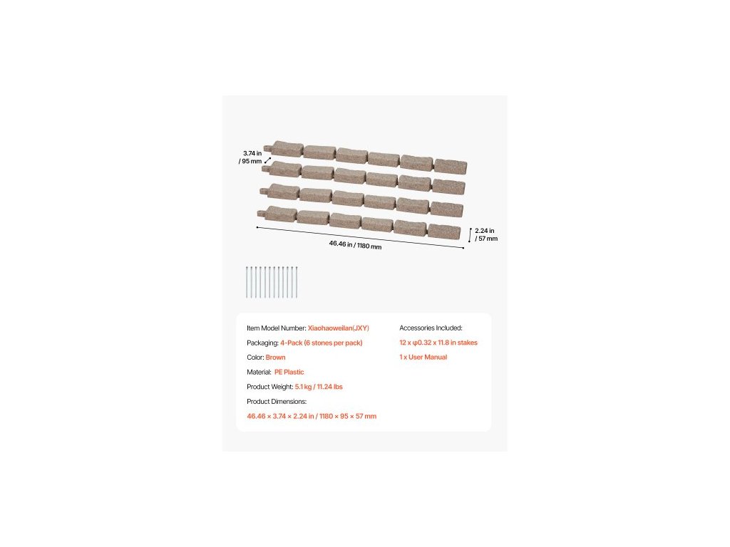 Zahradní lemování z umělého kamene, 46,4 x 2,2 palce, realistické lemování trávníku, flexibilní zahradní lemování o velikosti cihly s kotvicími hroty, odolné proti blednutí, hnědé barvy, vzhled přírodního kamene, snadná instalace, odolný proti blednutí materiál, lehký a snadno ovladatelný, promyšlené detaily, rychlá instalace, barva: hnědá, číslo modelu: Xiaohaoweilan (JXY), balení: 4 kusy (6 kamenů v balení), hmotnost výrobku: 5,74 kg / 12,65 lbs, materiál: PE plast, rozměry výrobku: 1180 x 95 x 57 mm / 46,46 × 3,74 × 2,24 palceDoplňkové parametry