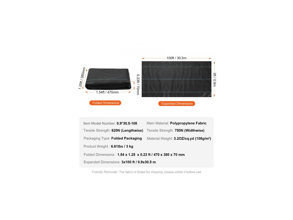 Pevnost v tahu: 750N (na šířku),Typ balení: Složené balení,Číslo modelu položky: 0,9*30,5-108,Hmotnost výrobku: 6,61 lbs / 3 kg,Rozměry v rozloženém stavu: 3 x 100 ft / 0,9 x 30,5 m,Rozměry ve složeném stavu: 1,54 x 1,25 x 0,23 ft / 470 x 380 x 70 mm,Hlavní materiál: Polypropylen Gramáž látky, materiál: 108 g/m²