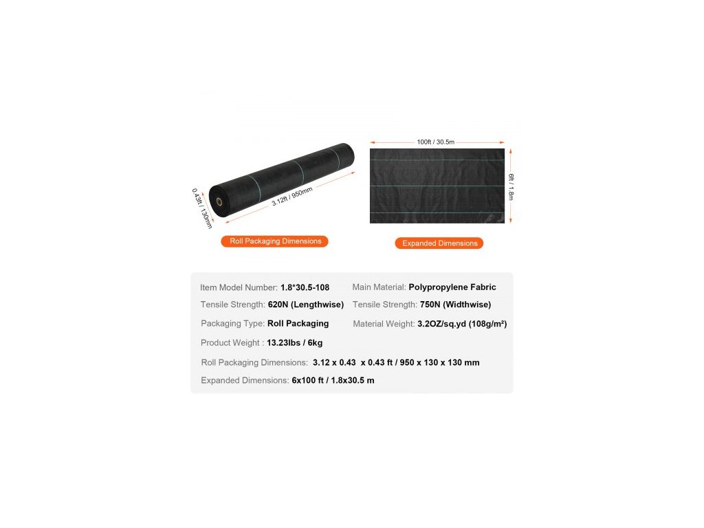 Pevnost v tahu: 750N (na šířku),Rozměry balení v roli: 3,12 x 0,43 x 0,43 stopy / 950 x 130 x 130 mm,Typ balení: Balení v roli,Číslo modelu položky: 1,8*30,5-108,Hmotnost výrobku: 13,23 lbs / 6 kg,Rozměry v rozloženém stavu: 6 x 100 stop / 1,8 x 30,5 m,Hlavní materiál: Polypropylenová tkanina, gramáž materiálu: 3,2 oz/čtvereční yard (108 g/m²)