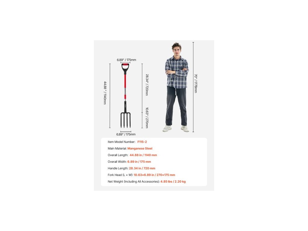 Délka rukojeti: 720 mm / 28,34 palce, Čistá hmotnost (včetně veškerého příslušenství): 4,85 lbs / 2,20 kg, Celková šířka: 6,89 palce / 175 mm, Číslo modelu položky: F115-2, Celková délka: 44,88 palce / 1140 mm, Hlava vidle (D × Š): 10,63 × 6,89 palce / 270 × 175 mm, hlavní materiál: manganová ocel