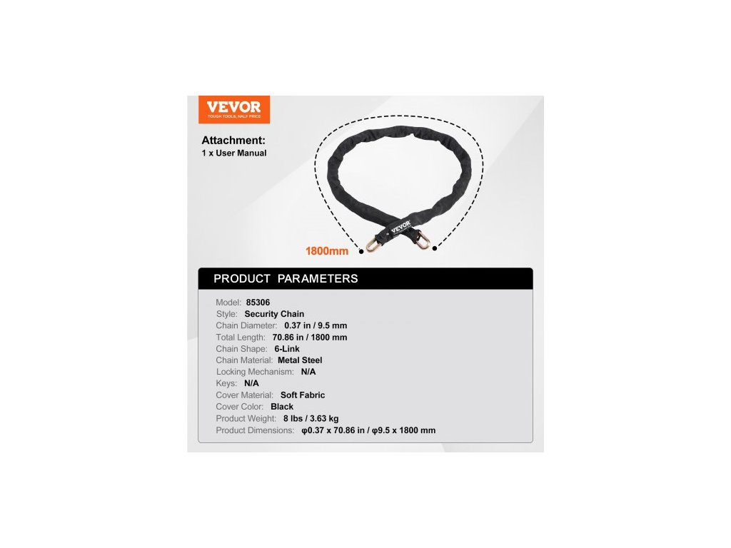 Celková délka: 70,86 palce / 1800 mm,Barva krytu: Černá,Zamykací mechanismus: Není k dispozici,Tvar řetězu: 6článkový,Klíče: Není k dispozici,Model: 85306,Materiál krytu: Měkká tkanina,Hmotnost výrobku: 8 lbs / 3,63 kg,Styl: Bezpečnostní řetěz,Materiál řetězu: Kovová ocel,Rozměry výrobku: φ0,37 x 70,86 palce / φ9,5 x 1800 mm,Průměr řetězu: 0,37 palce / 9,5 mm