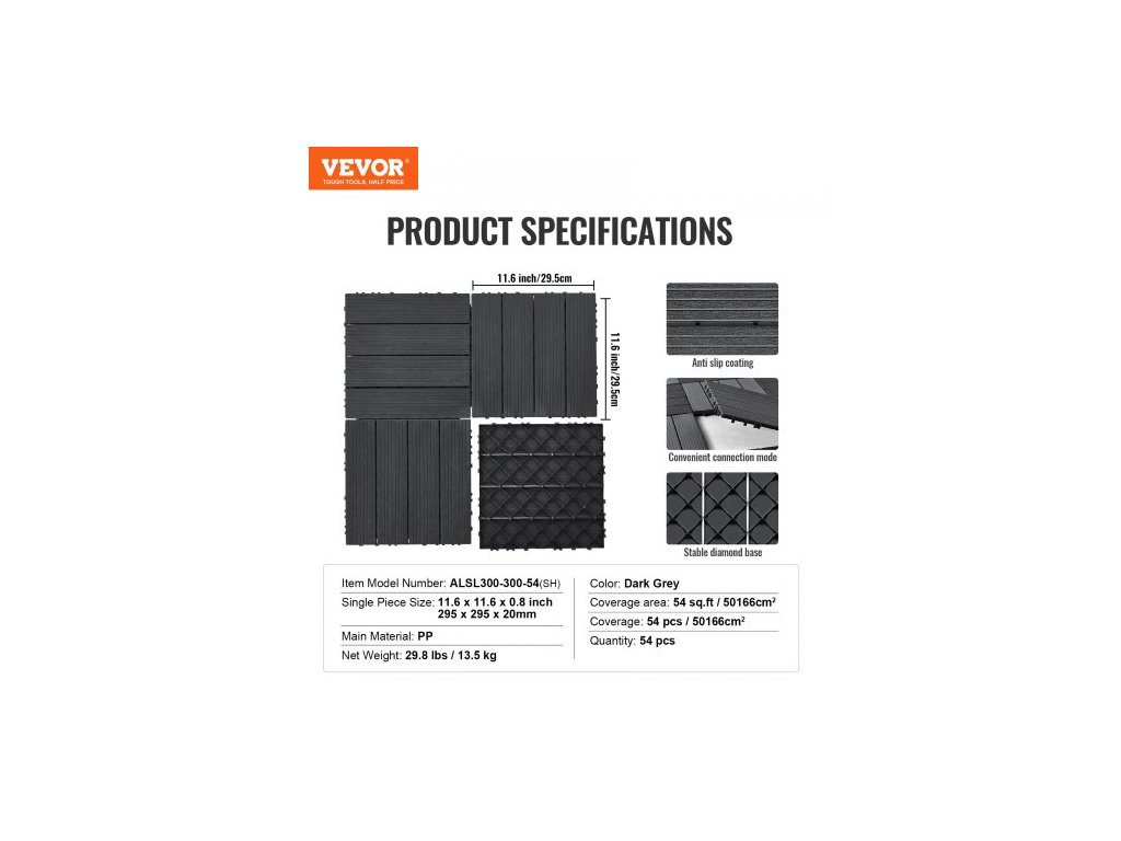 Celková čistá hmotnost: 29,8 lbs / 13,5 kg, Barva: tmavě šedá, Číslo modelu položky: ALSL300-300-54(SH), Množství: 54 ks, Pokrytí: 54 čtverečních stop / 50166 c㎡, Velikost jednoho kusu: 11,8 x 11,8 x 0,8 palce / 300 x 300 x 20 mm, Hlavní materiál: PP