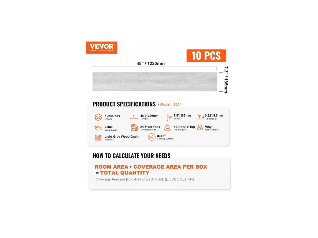 Vzor: světle šedá dřevěná kresba, Tloušťka zvukotěsné rohože: 0,06/1,5 mm, Délka: 48''/914 mm, Model: 504, Množství: 10 ks/krabice, Výška: 0,22''/5,5 mm, Plocha krytí: 24,5² stop/krabice, Šířka: 7,3''/152 mm, Čistá hmotnost: 42,1 libry/19,1 kg, Tloušťka nášlapné vrstvy: 0,56 mm/22 mil, hlavní materiál: Vinyl