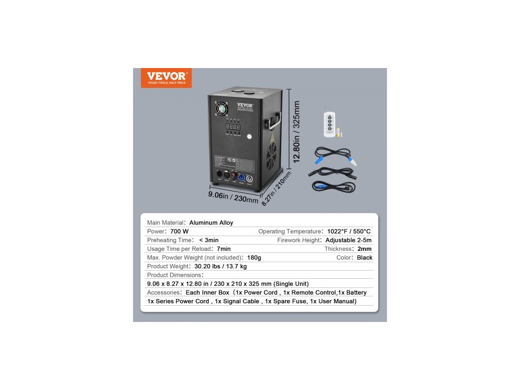 Provozní teplota: 1022 °F/550 °C, Doba předehřívání: <3 min, Barva: Černá, Množství: 2, Výška ohňostroje: Nastavitelná 2-5 m, Pouzdro: Materiál: Hliníková slitina (6063-T5); Tloušťka: 2 mm, Rozměry produktu: 9,06 x 8,27 x 12,80 palce / 230 x 210 x 325 mm (jedna jednotka), Napěťová frekvence: AC 220-240 V 50 Hz/60 Hz, Model: BJY-PHJ700u2, Hmotnost produktu: 30,20 lbs / 13,7 kg, Doba použití na jedno nabití: 7 min, Maximální vstřikované množství: 180 g, Výkon: 700 W, Hlavní materiál: Hliníková slitina (6063-T5)