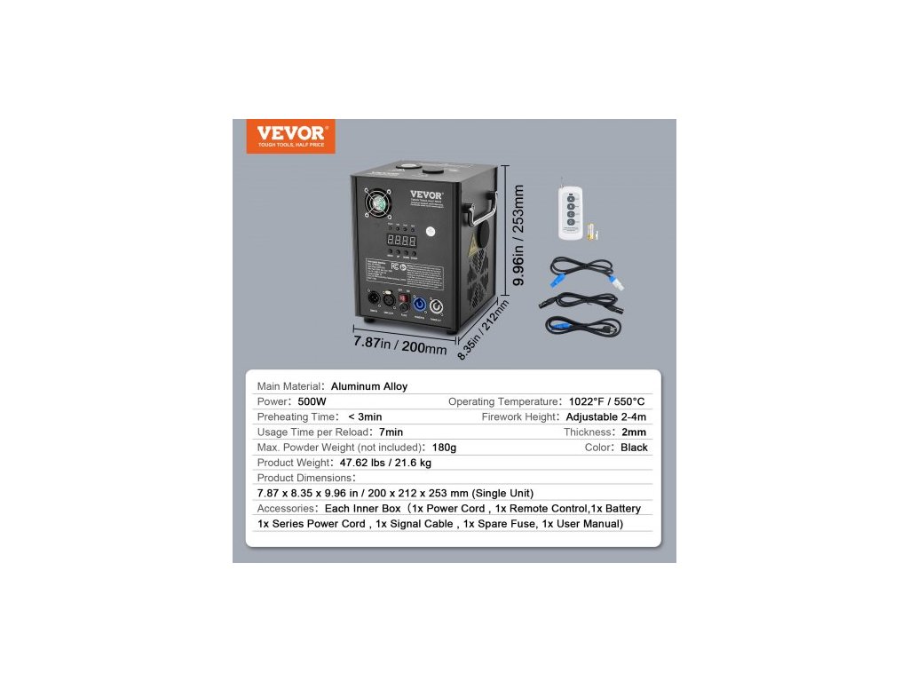 Provozní teplota: 1022 °F/550 °C, Doba předehřívání: <3 min, Barva: Černá, Množství: 4, Výška ohňostroje: Nastavitelná 2-4 m, Pouzdro: Materiál: Hliníková slitina (6063-T5); Tloušťka: 2 mm, Rozměry produktu: 7,87 x 8,35 x 9,96 palce / 200 x 212 x 253 mm (jedna jednotka), Napěťová frekvence: AC 220-240 V 50 Hz/60 Hz, Model: BJY-PHJ500u2, Hmotnost produktu: 47,62 liber / 21,6 kg, Doba použití na jedno nabití: 7 min, Maximální vstřikované množství: 180 g, Výkon: 500 W, Hlavní materiál: Hliníková slitina (6063-T5)