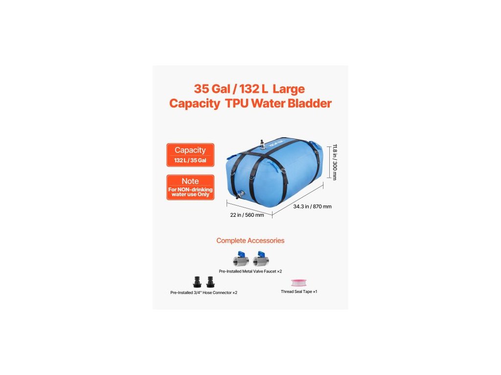 Tloušťka vaku: 0,7 mm ±0,05 mm,Provozní teplota: -22 °F až 158 °F / -30 °C až 70 °C,Typ produktu: Styl vaku,Barva: Modrá,Číslo modelu položky: WSB-132L-Blue,Maximální kapacita: 132 l / 35 gal,Rozměry produktu: 34,3 × 22 × 11,8 palce / 870 × 560 × 300 mm,Netto Hmotnost: 2,3 kg / 5,1 lbs, Velikost přírubového konektoru (vstup/výstup): Vnitřní Ø 25 mm / Vnější Ø 30 mm, Hlavní materiál: TPU (hustota 1000D, 0,7 mm ± 0,05 mm)