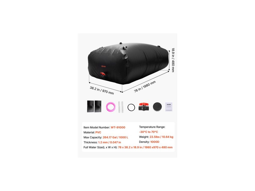 Tloušťka: 1,2 mm/0,047",Plná velikost nádrže na vodu (D x Š x V): 78 x 38,2 x 18,9 palce / 1980 x 970 x 480 mm,Maximální kapacita: 264,17 galonů/1000 l,Číslo modelu položky: WT-91000,Teplotní rozsah: -30 °C až 70 °C,Materiál: PVC,Hustota: 1000D,Hmotnost: 23,5 liber / 10,64 kg