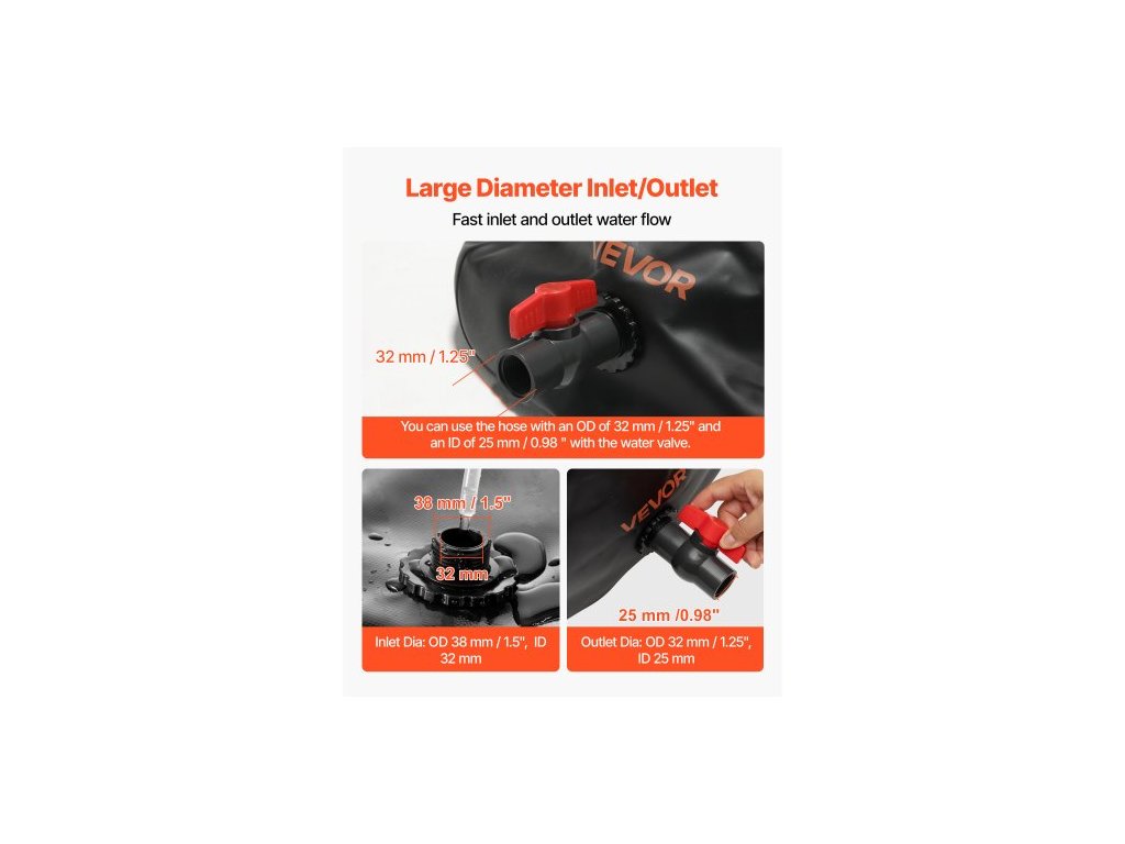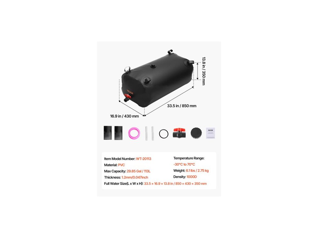 Tloušťka: 1,2 mm/0,047",Plná velikost nádrže na vodu (D x Š x V): 33,5 x 16,9 x 13,8 palce / 850 x 430 x 350 mm,Maximální kapacita: 29,85 galonů/113 l,Číslo modelu položky: WT-20113,Teplotní rozsah: -30 °C až 70 °C,Materiál: PVC,Hustota: 1000D,Hmotnost: 6,1 liber / 2,75 kg