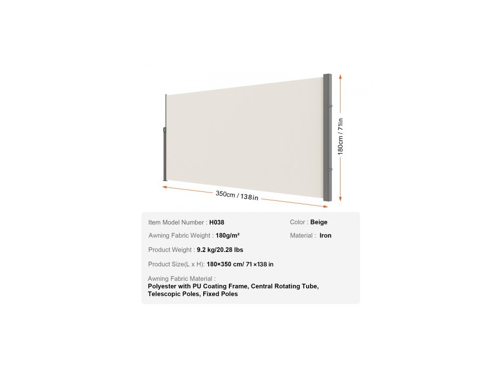 Rám, centrální otočná trubka, teleskopické tyče, pevné tyče Materiál: Železo,Rozměry výrobku (D x V): 180×350 cm/5,91x11,48 FT,Hmotnost markýzy: 180g/m²,Materiál markýzy: Polyester s PU povlakem,Barva: Béžová,Číslo modelu položky: H038,Hmotnost výrobku: 9,2 kg/20,28 lbs