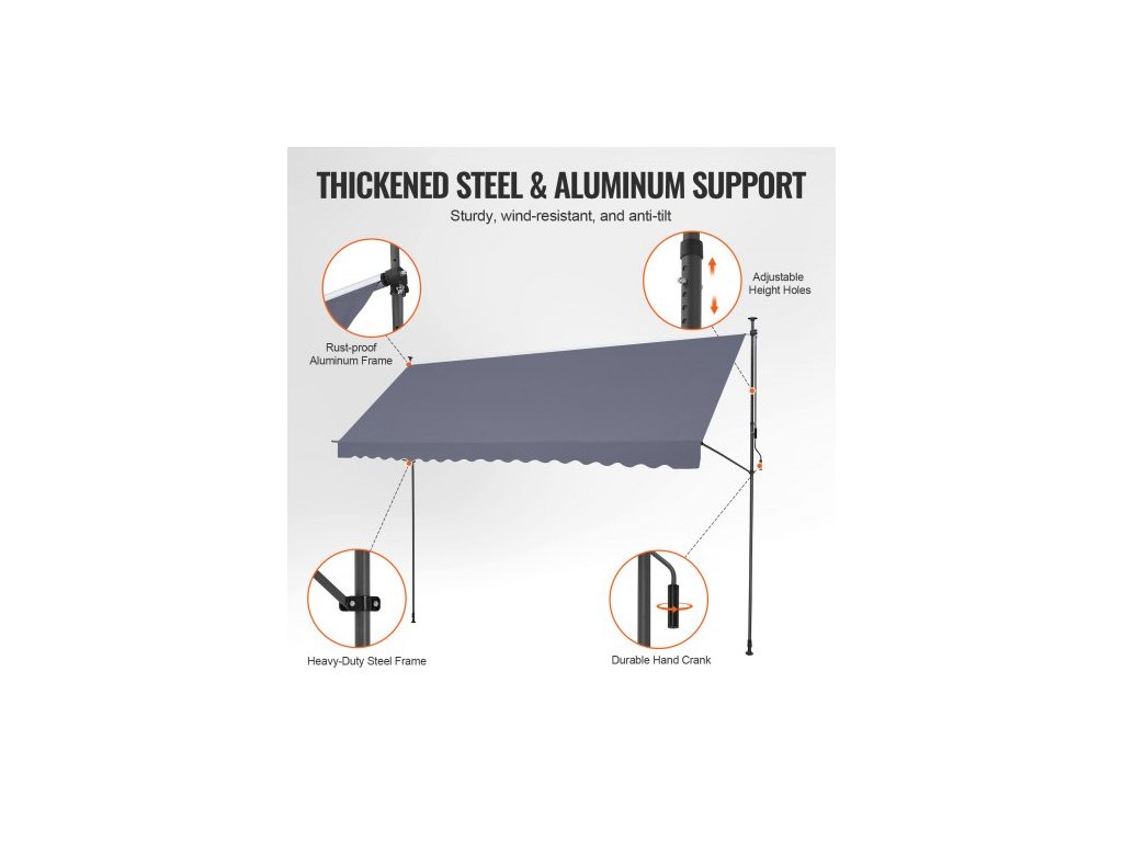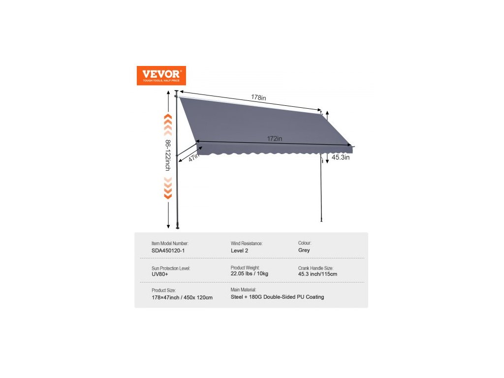 Velikost kliky: 45,3 palce/115 cm,Číslo modelu položky: SDA450120-1,Odolnost proti větru: Úroveň 2,Hmotnost výrobku: 22,05 lbs/10 kg,Hlavní materiál: Ocel + oboustranný PU povlak 180G,Úroveň ochrany před sluncem: UV80+,Barva: Šedá,Rozměry výrobku: 178 × 47 palců/450 x 120 cm