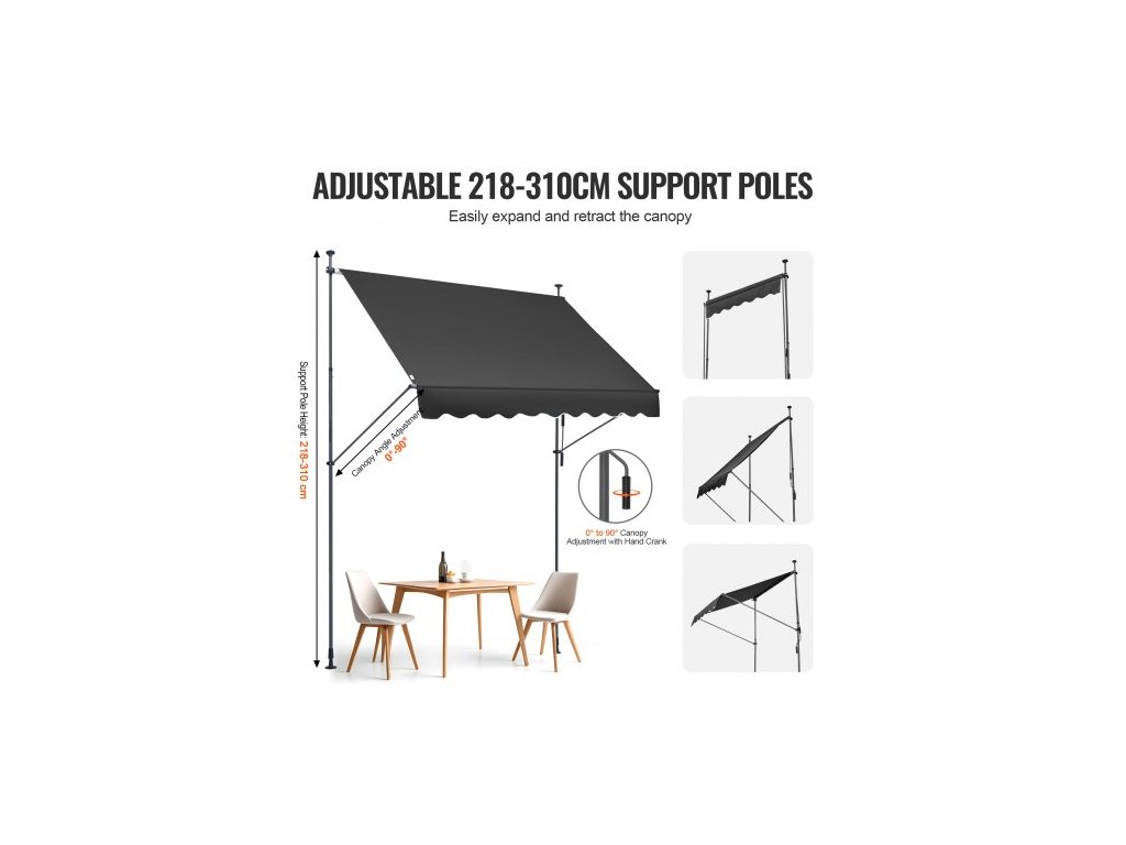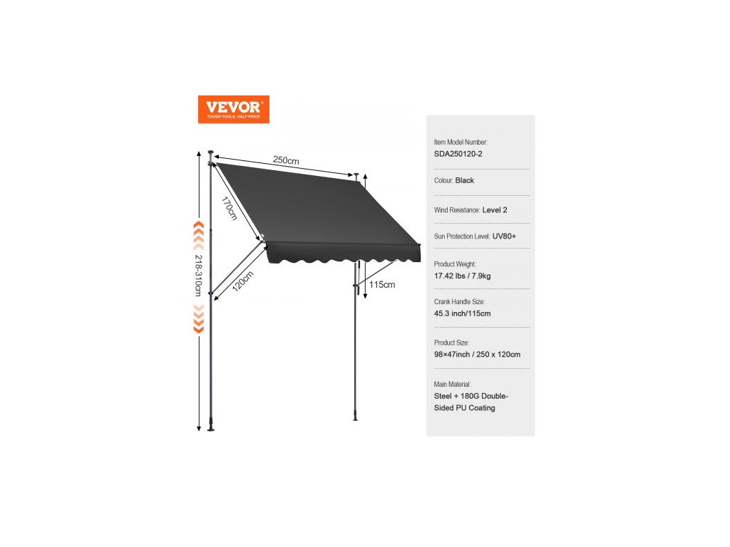 Velikost kliky: 45,3 palce/115 cm,Číslo modelu položky: SDA250120-2,Odolnost proti větru: Úroveň 2,Hmotnost výrobku: 17,42 lbs/7,9 kg,Hlavní materiál: Ocel + oboustranný PU povlak 180G,Úroveň ochrany před sluncem: UV80+,Barva: Černá,Rozměry výrobku: 98×47 palců/250 x 120 cm