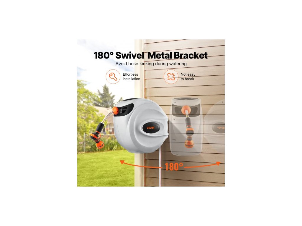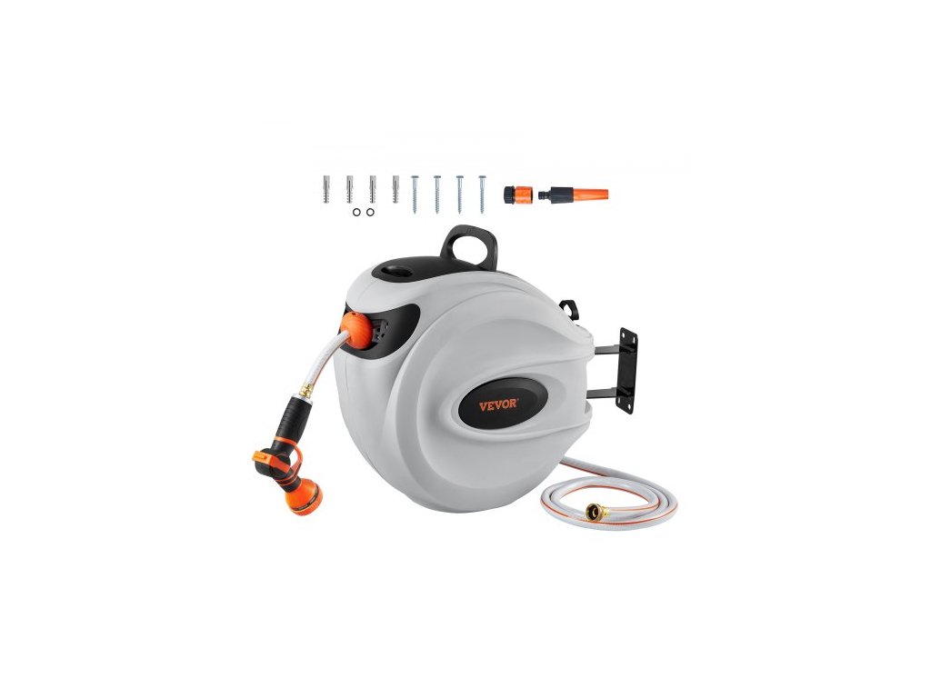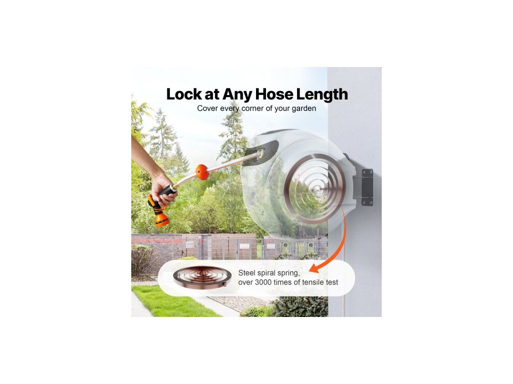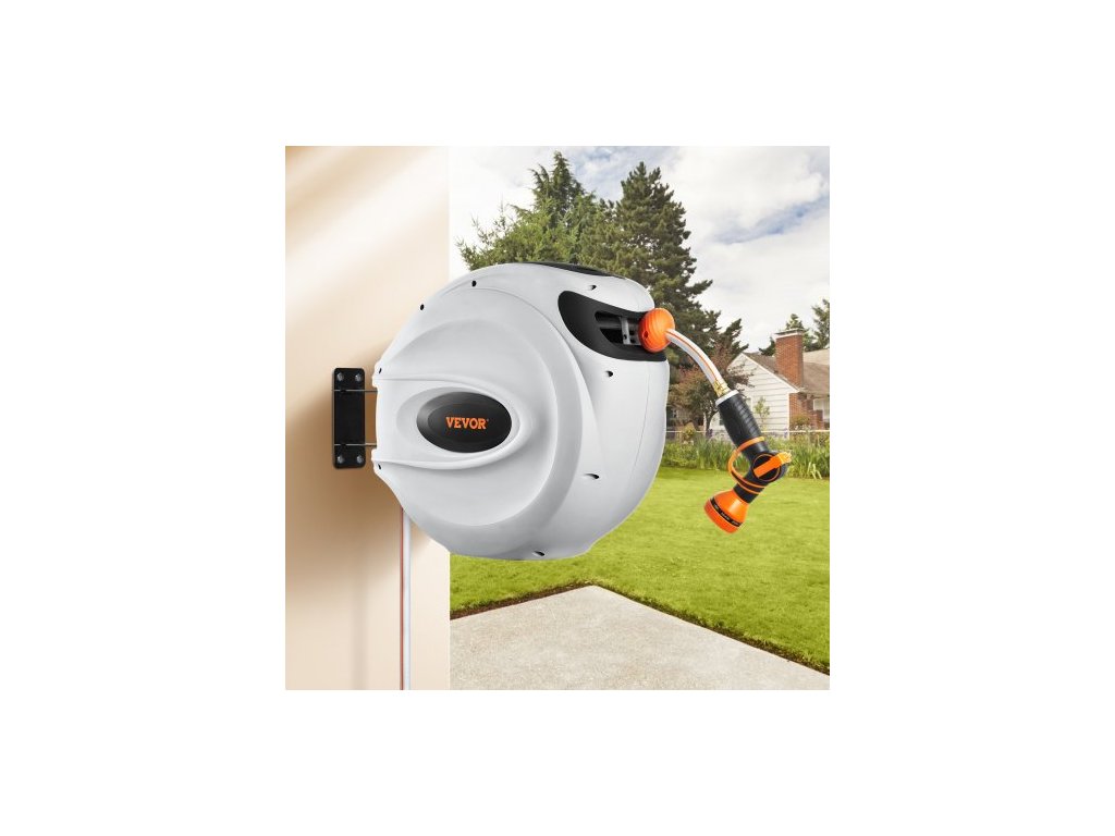 Zatahovací naviják zahradní hadice , nástěnný naviják na hadici 1/2" x 131,23 stop, odolný naviják na zahradní hadici s tryskou s 9 režimy, aretací libovolné délky, automatickým systémem pomalého návratu a otočným držákem o 180°