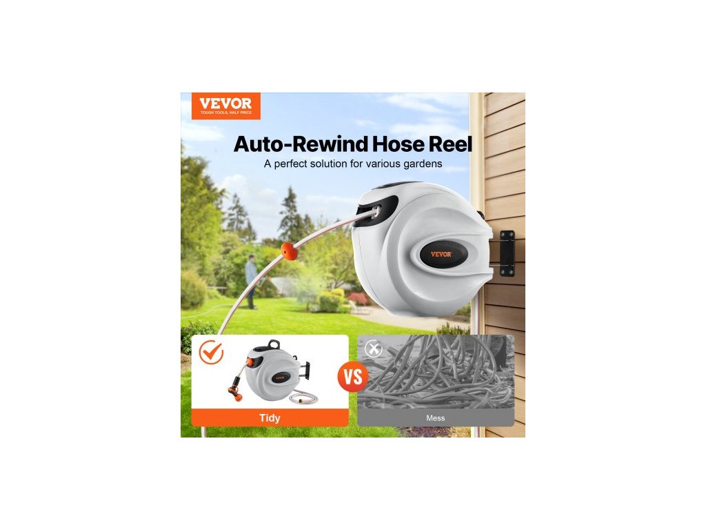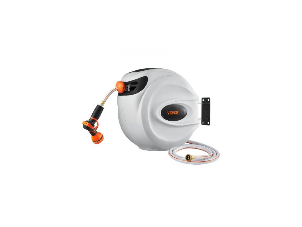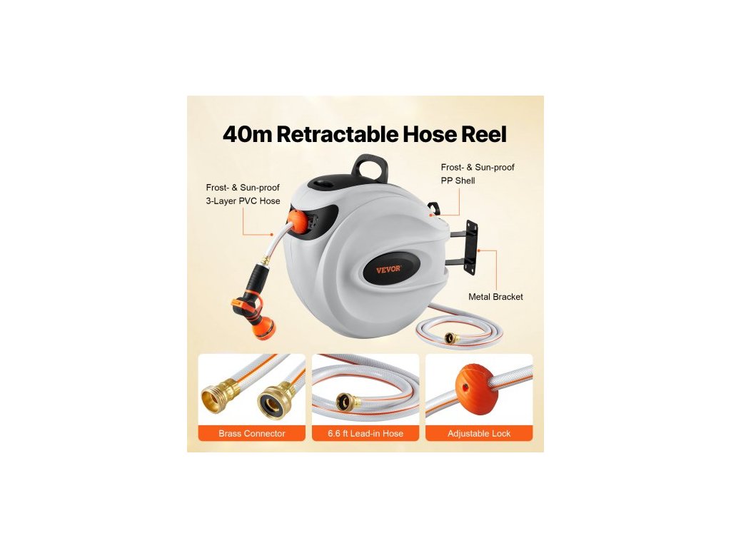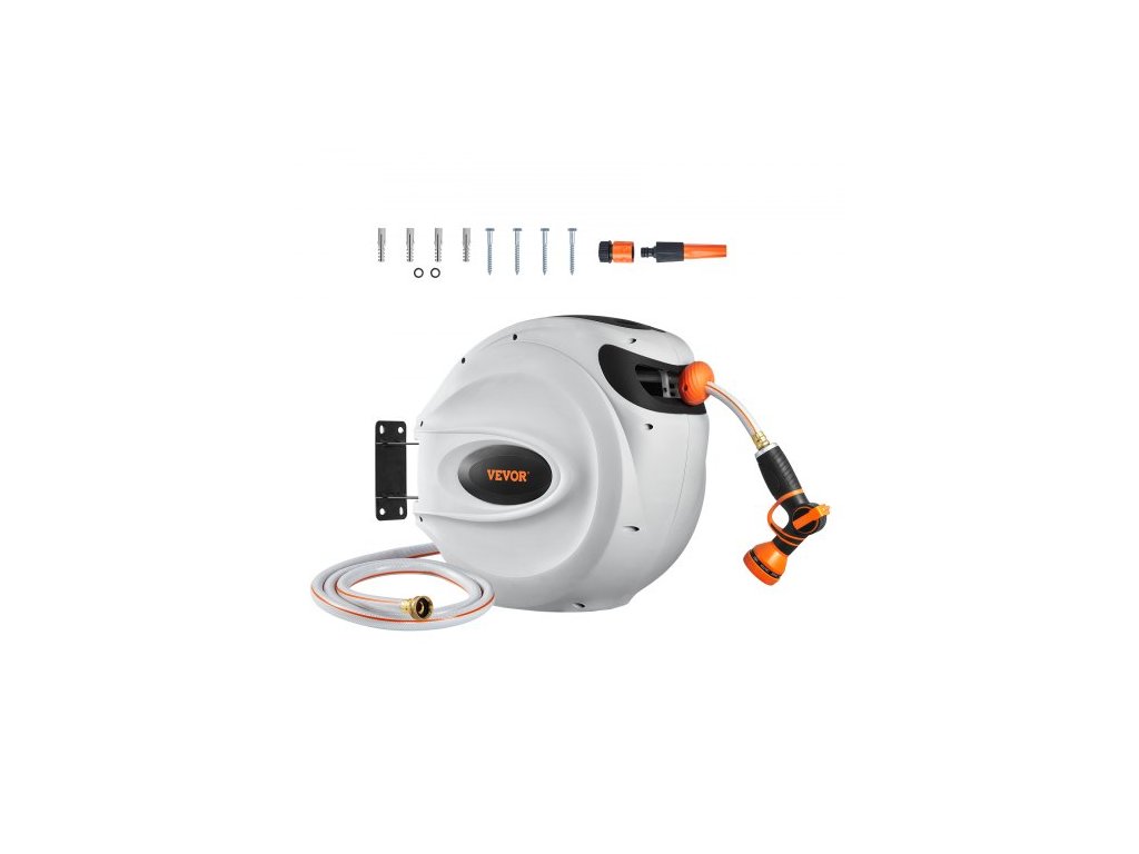 Zatahovací naviják zahradní hadice , nástěnný naviják na hadici 1/2" x 131,23 stop, odolný naviják na zahradní hadici s tryskou s 9 režimy, aretací libovolné délky, automatickým systémem pomalého návratu a otočným držákem o 180°