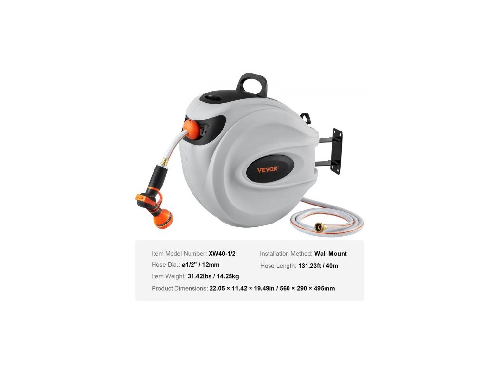 Délka hadice: 131,23 stop/40 m,Typ instalace: Nástěnná,Číslo modelu položky: XW40-1/2,Rozměry výrobku: 22,05 x 11,42 x 19,49 palců/560 x 290 x 495 mm,Průměr hadice: ø1/2"/12 mm,Čistá hmotnost: 31,42 liber/14,25 kg