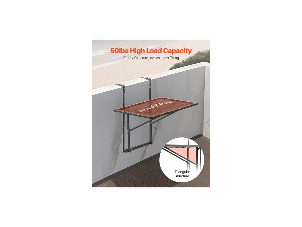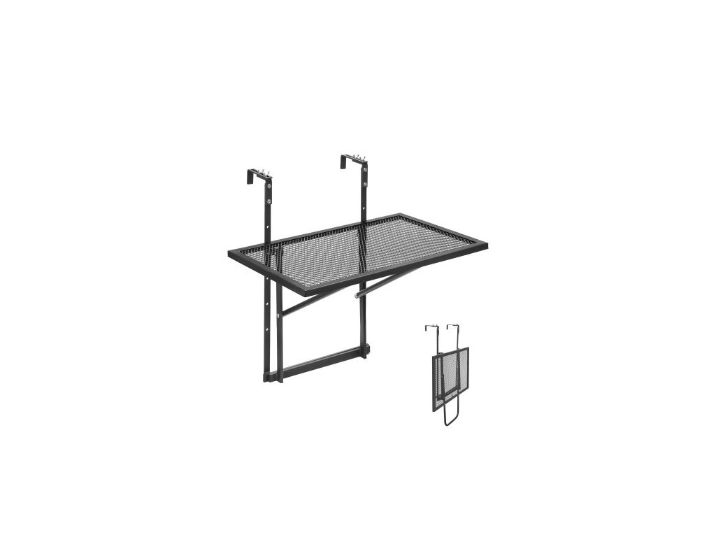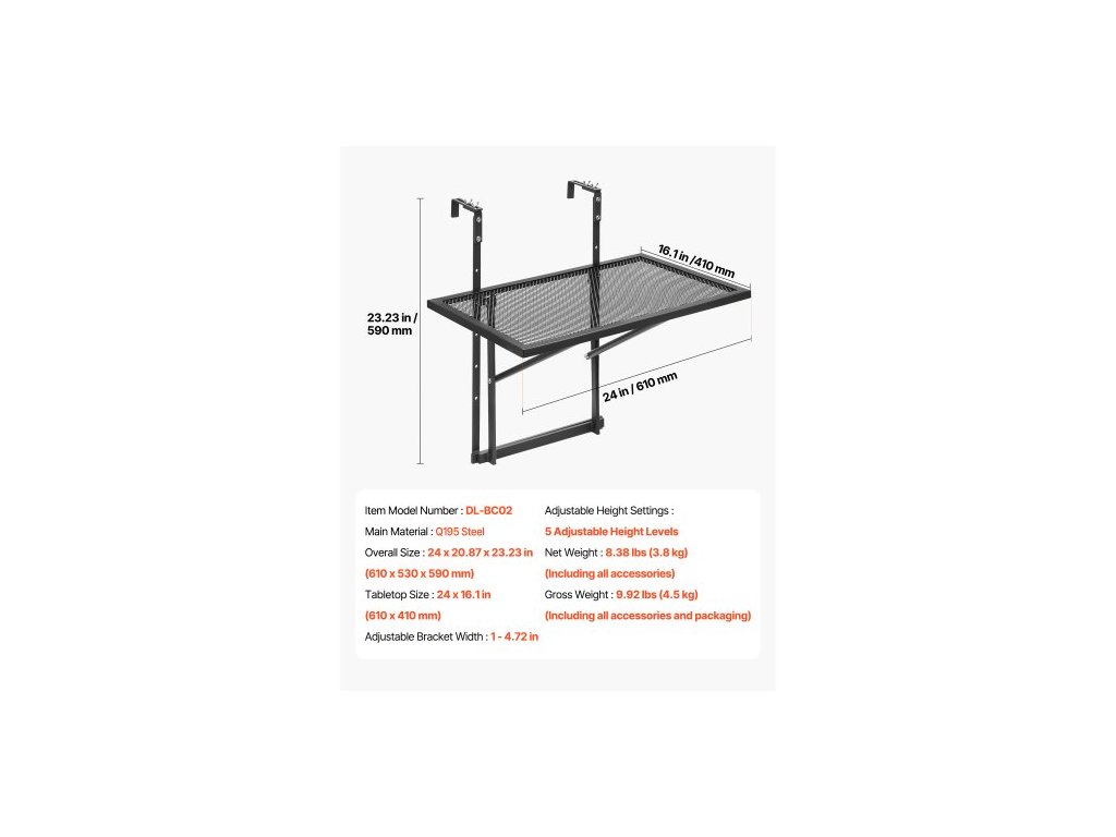 Závěsný stůl na balkon , kovový skládací stůl na balkonové zábradlí 19 x 24 palců, venkovní barový stůl na balkon, nastavitelný v 5 úrovních, vhodný pro zábradlí od 1" do 4,7", servírovací stůl na terasu a terasu