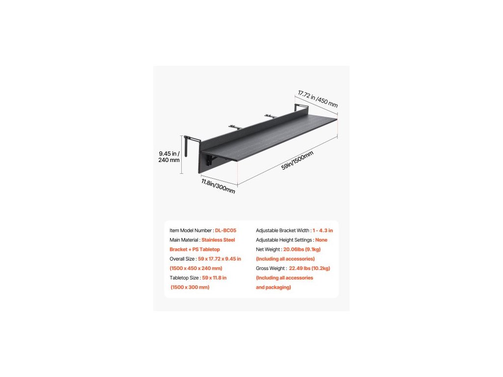 Rozměry desky stolu: 59 x 11,8 palců (1500 x 300 mm),Hrubá hmotnost: 21,38 liber (9,7 kg) (včetně veškerého příslušenství a obalu),Šířka nastavitelného držáku: 1 - 5,91 palců,Číslo modelu položky: DL-BC05,Nastavitelná výška: Žádná,Celková velikost: 59 x 17,72 x 9,45 palce (1500 x 450 x 240 mm), Čistá hmotnost: 19,4 lbs (8,8 kg) (včetně veškerého příslušenství), Hlavní materiál: Konzola z nerezové oceli + deska stolu z PS