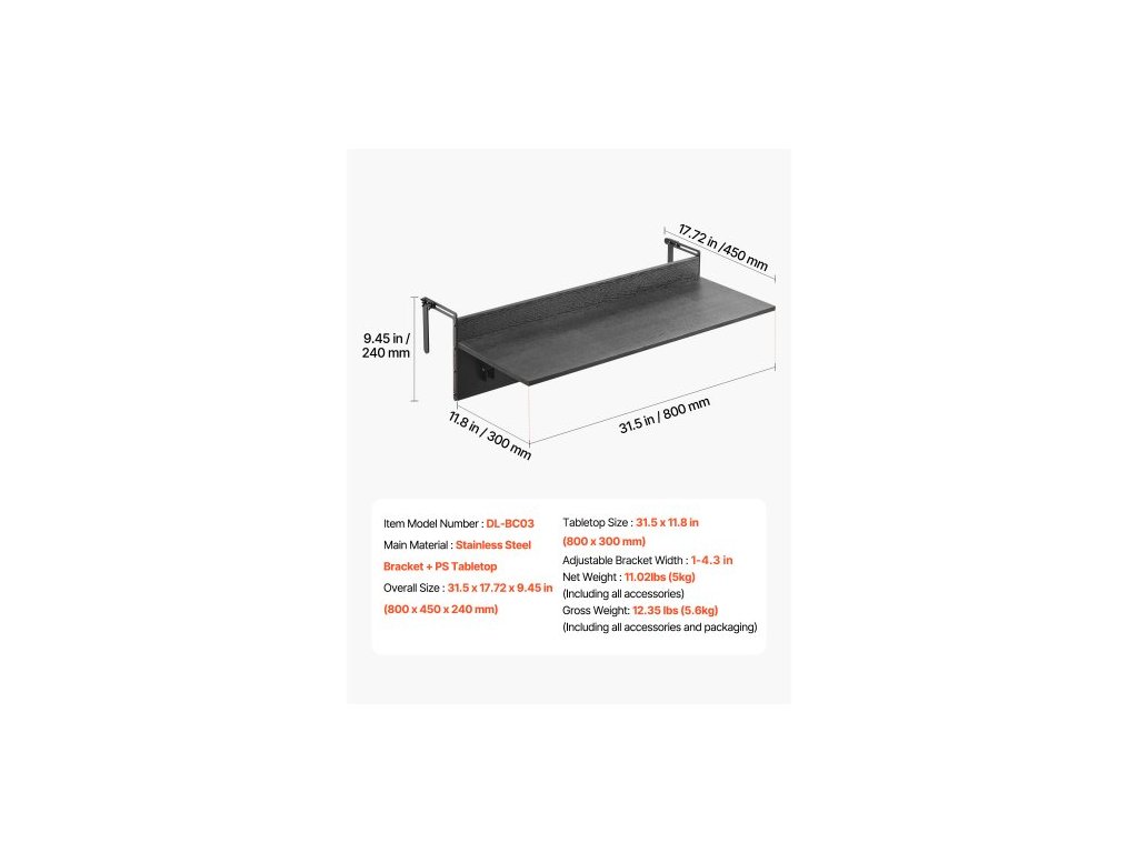 Rozměry desky stolu: 800 x 300 mm, Celková hmotnost: 5 kg (včetně veškerého příslušenství a obalu), Šířka nastavitelného držáku: 2,5 - 11,3 cm, Číslo modelu: DL-BC03, Nastavení výšky: Žádné, Celkové rozměry: 800 x 450 x 240 mm, Čistá hmotnost: 4,4 kg (včetně veškerého příslušenství), Hlavní materiál: Držák z nerezové oceli + deska stolu z PS
