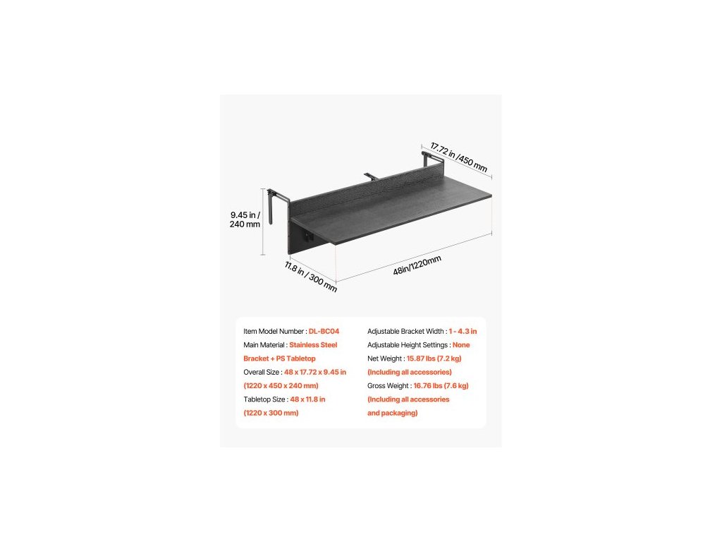 Rozměry desky stolu: 48 x 11,8 palců (1220 x 300 mm),Hrubá hmotnost: 16,76 liber (7,6 kg) (včetně veškerého příslušenství a obalu),Šířka nastavitelného držáku: 1 - 4,3 palce,Číslo modelu položky: DL-BC04,Nastavitelné nastavení výšky: Žádné,Celkové rozměry: 48 x 17,72 x 9,45 1220 x 450 x 240 mm, Čistá hmotnost: 7,2 kg (včetně veškerého příslušenství), Hlavní materiál: Konzola z nerezové oceli + deska stolu z PS
