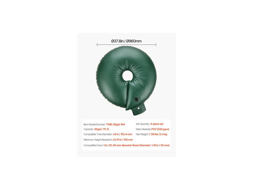 Množství v sadě: 4dílná sada,Objem: 20gal / 75,7 l,Číslo modelu položky: TWB-20gal-W4,Kompatibilní hadice: průměr 1 palec / 25,40 mm (vnitřní průměr: 1,18 palce / 30 mm),Minimální požadovaná výška: ≥5,91 palce / 150 mm,Čistá hmotnost: 7,50 liber / 3,4 kg,Hlavní materiál: PVC (520 g/m²),Kompatibilní se stromy Průměr: 5,51 palce / 140 mm
