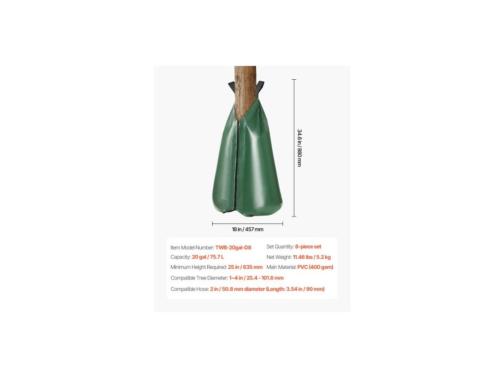 Množství v sadě: 8dílná sada,Objem: 20gal / 75,7 l,Číslo modelu položky: TWB-20gal-D8,Kompatibilní hadice: Průměr 2 palce / 50,8 mm (Délka: 3,54 palce / 90 mm),Minimální požadovaná výška: 25 palců / 635 mm,Čistá hmotnost: 11,46 liber / 5,2 kg,Hlavní materiál: PVC (400 g/m²),Kompatibilní průměr stromu: 1–4 palce / 25,4–101,6 mm
