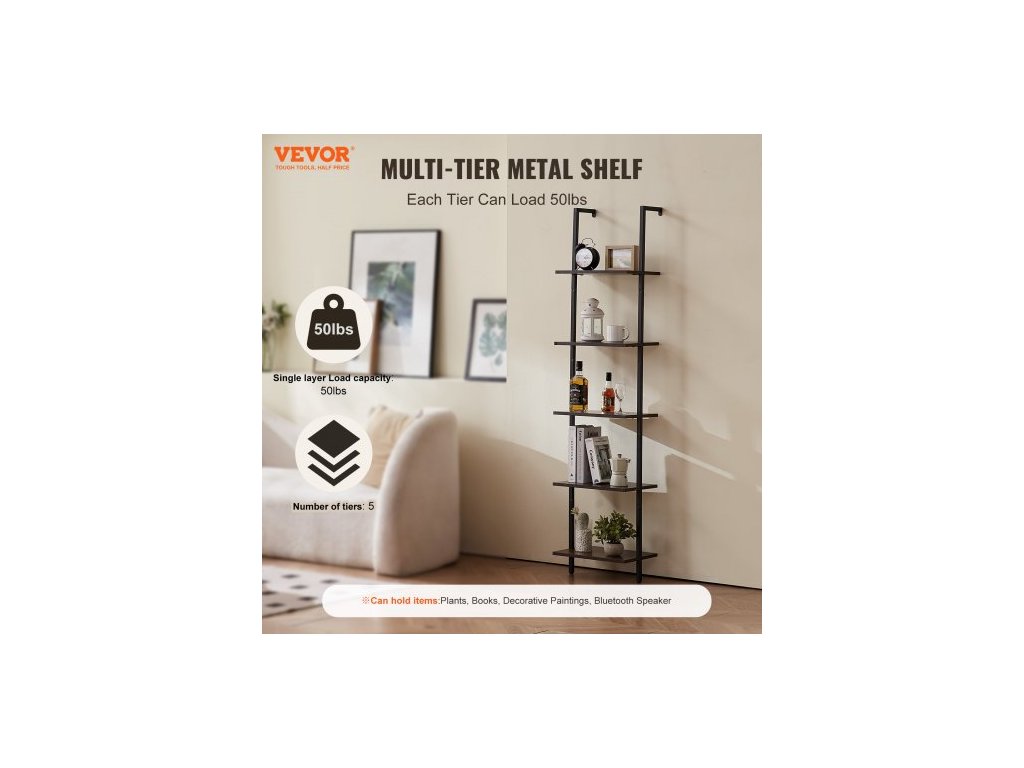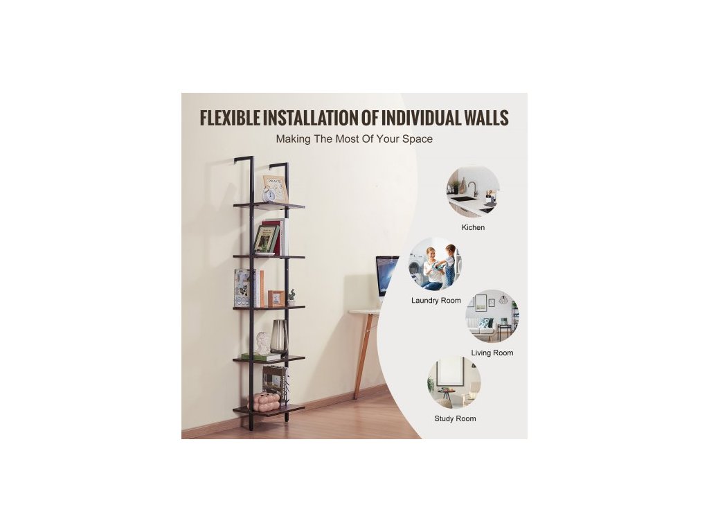 Žebříková police, 5patrová knihovna 15,6x11,8 palce, otevřená nástěnná žebříková police s kovovým rámem, úložný regál, držák na drobnosti do kuchyně, ložnice, koupelny, obývacího pokoje, černá