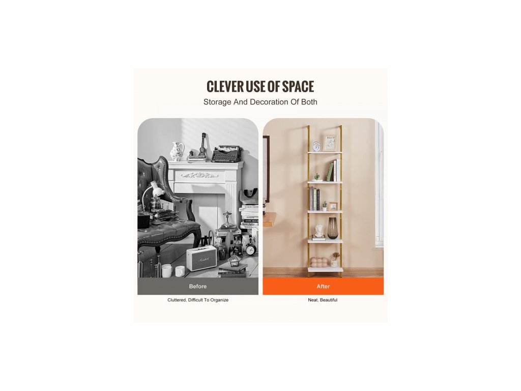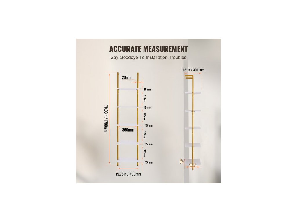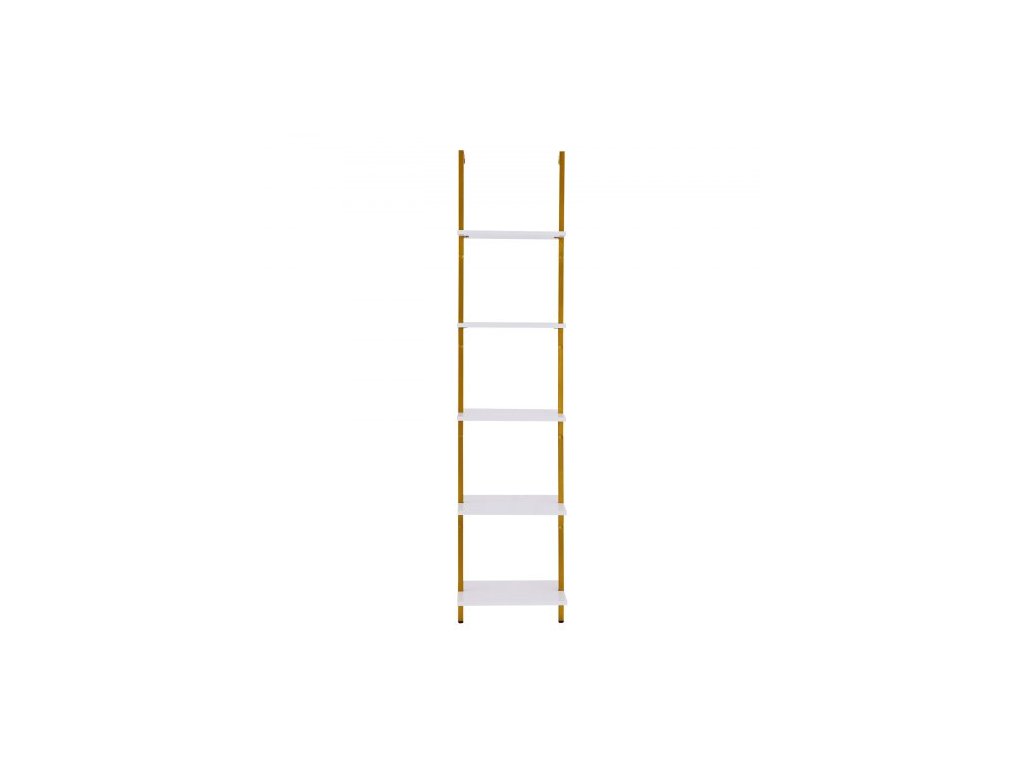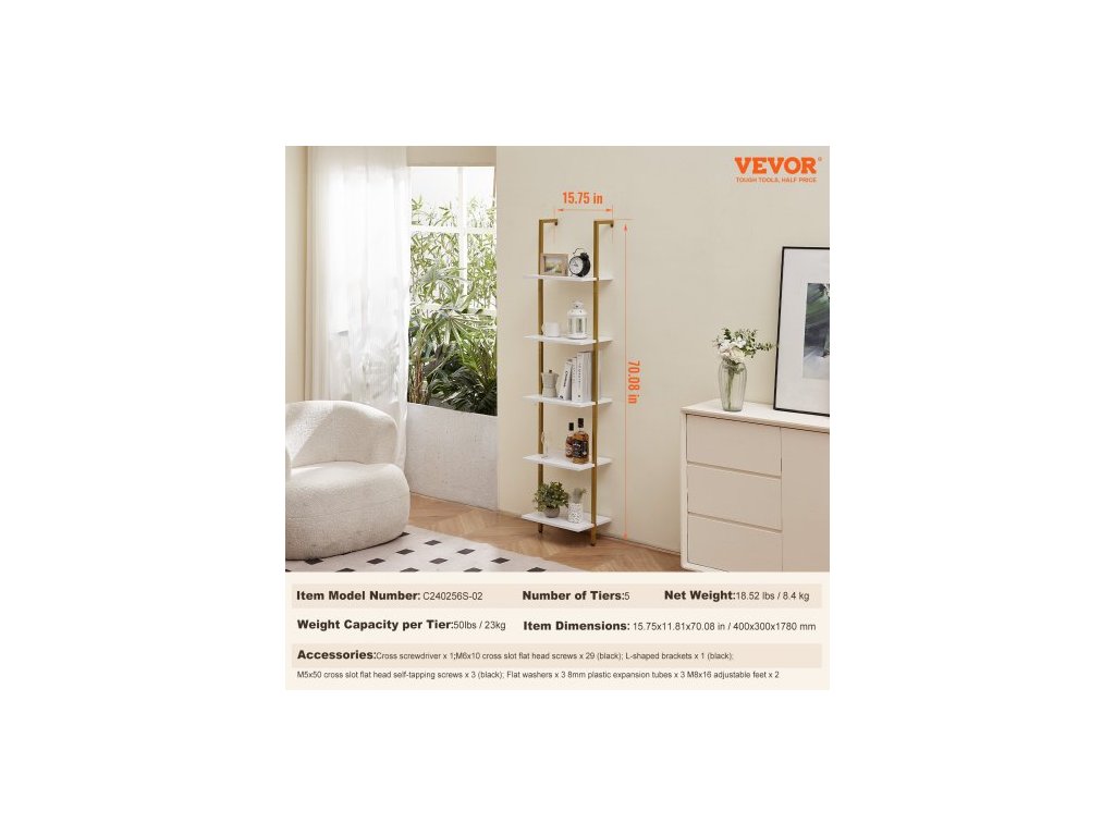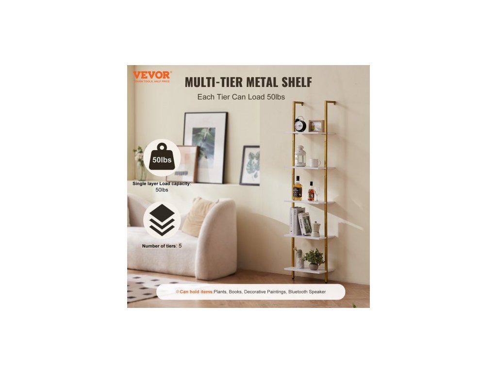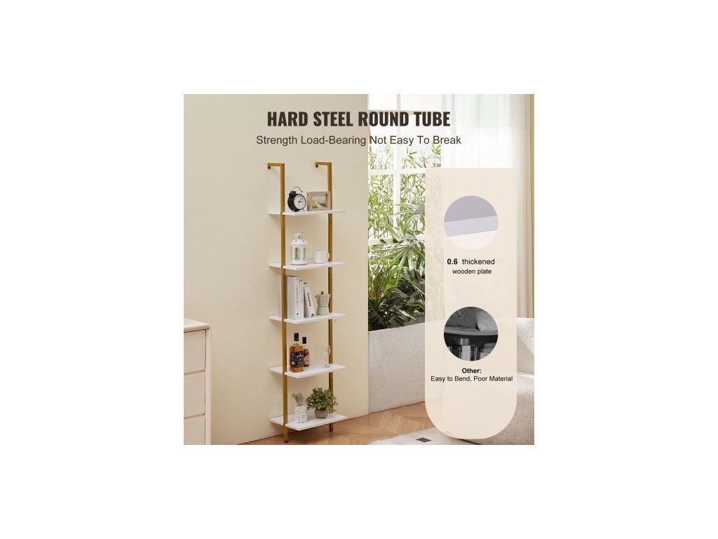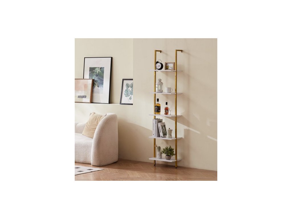 Žebříková police, 5patrová knihovna 15,6x11,8 palce, otevřená nástěnná žebříková police s kovovým rámem, úložný regál, držák na drobnosti do kuchyně, ložnice, koupelny, obývacího pokoje, zlatobílá