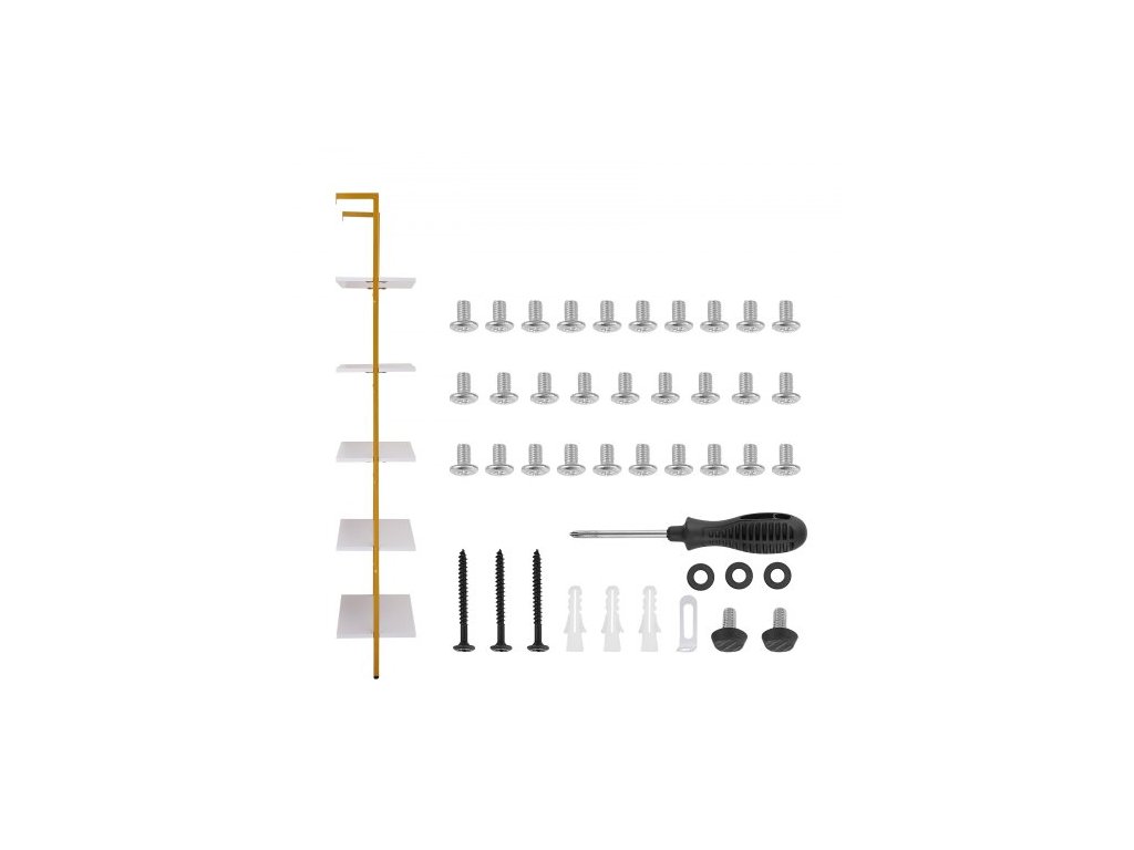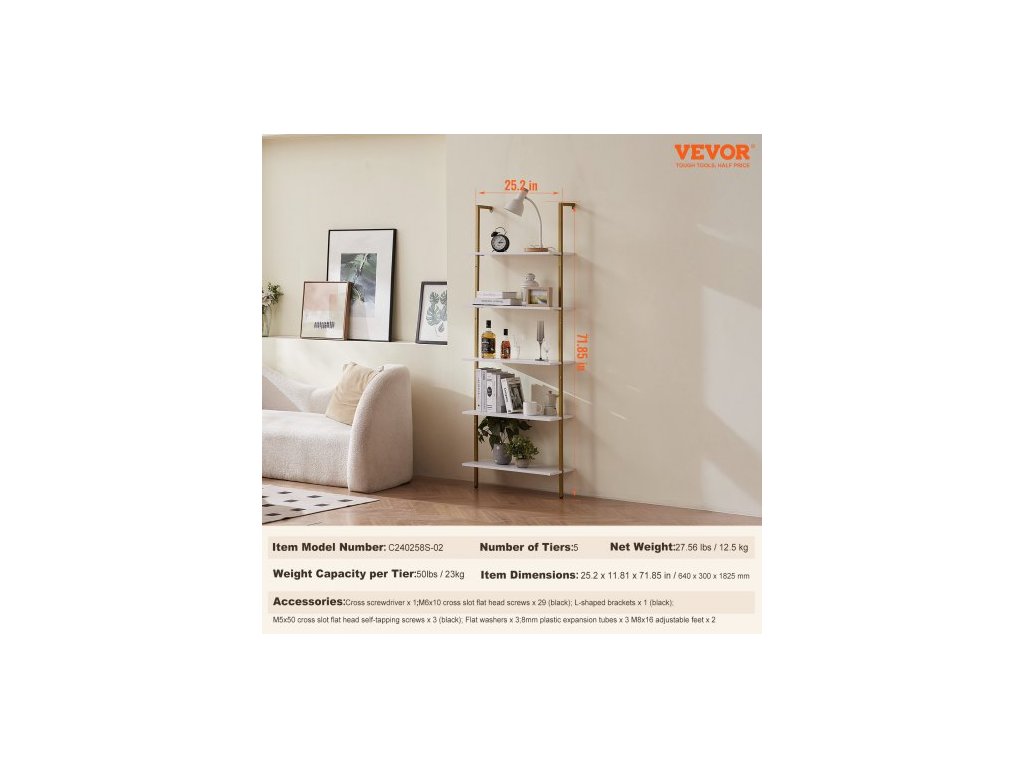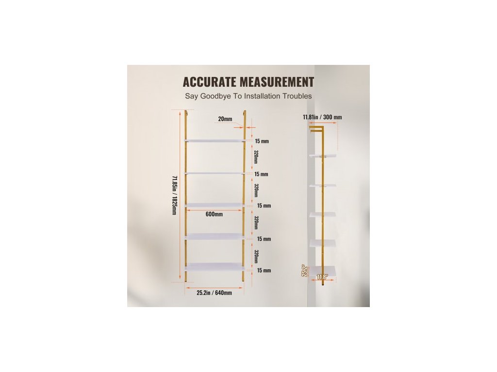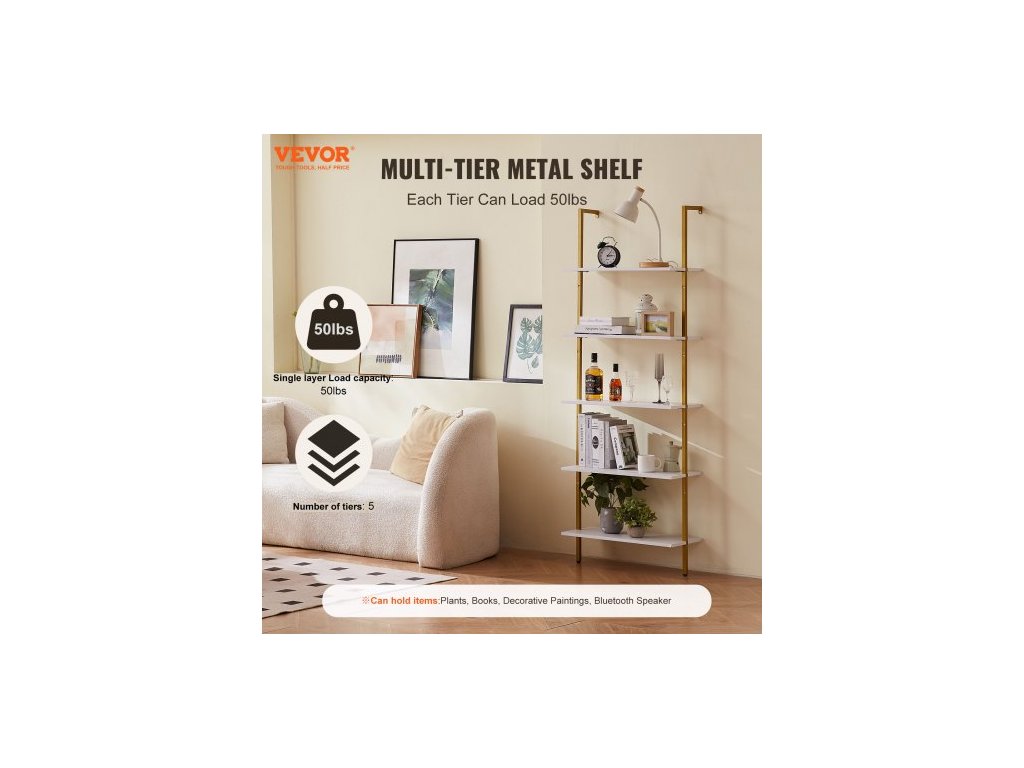 Žebříková police, 5patrová knihovna 24x11,8 palce, otevřená nástěnná žebříková police s kovovým rámem, úložný regál na drobnosti do kuchyně, ložnice, koupelny, obývacího pokoje, zlatobíláNerezová a odolná