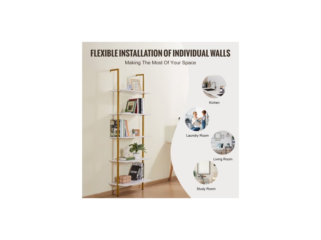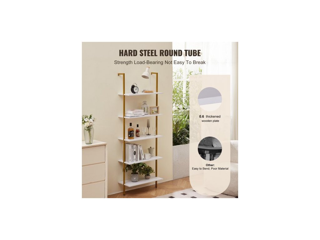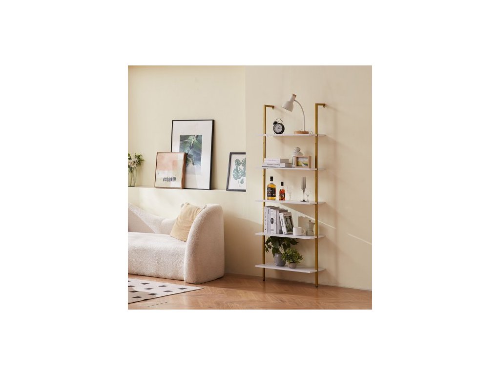 Žebříková police, 5patrová knihovna 24x11,8 palce, otevřená nástěnná žebříková police s kovovým rámem, úložný regál, držák na drobnosti do kuchyně, ložnice, koupelny, obývacího pokoje, zlatobílá
