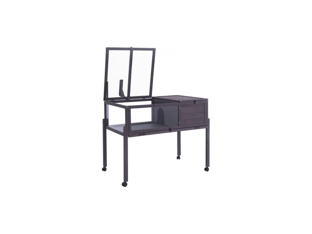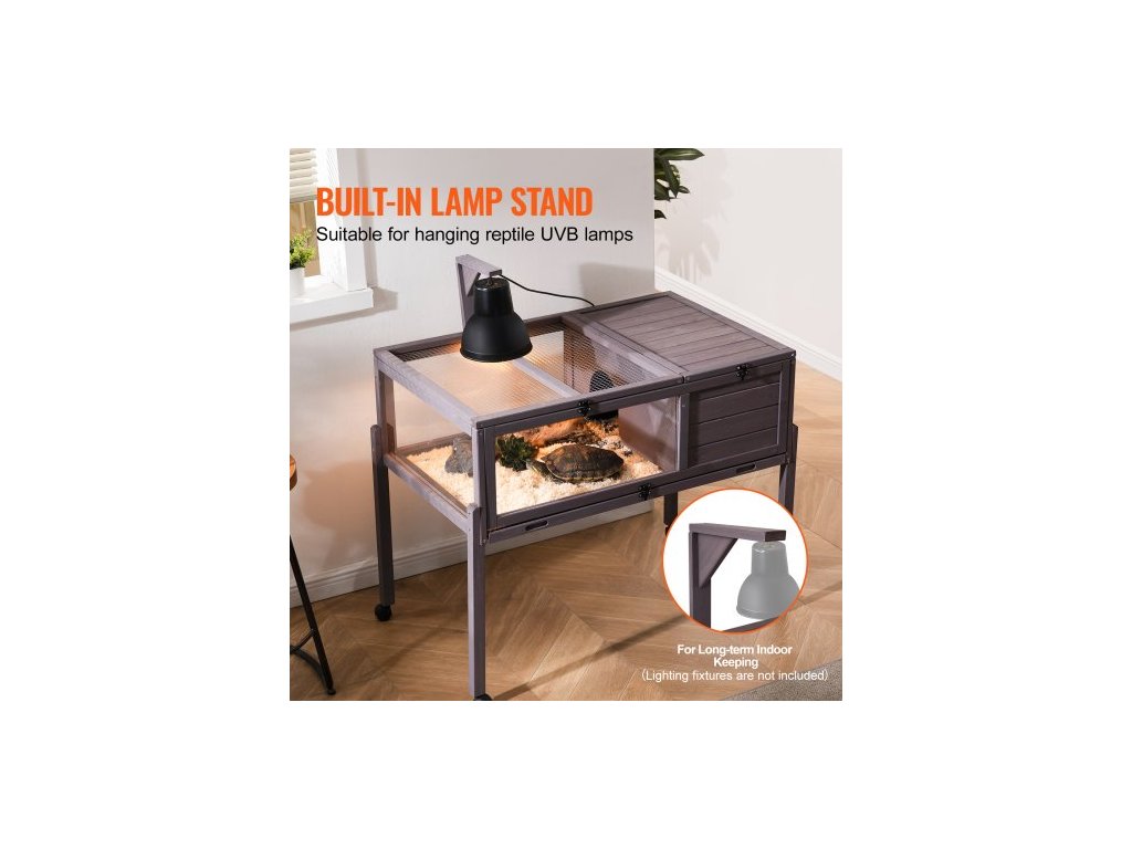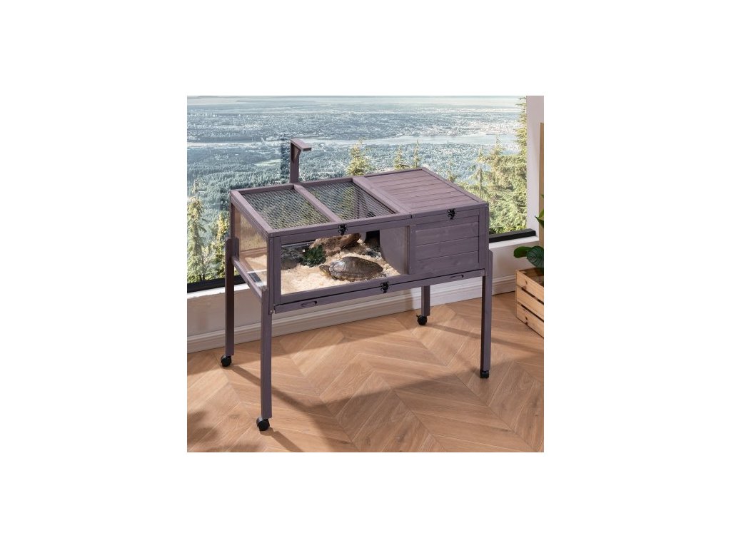 Želví habitat, dřevěný želví domek pro vnitřní i venkovní použití, pojízdný želví domek s podstavcem, klec pro plazy, klec pro malá zvířata s podstavcem, kolečka, pro gekony, ještěrky a hadyKonstrukce z masivního dřeva