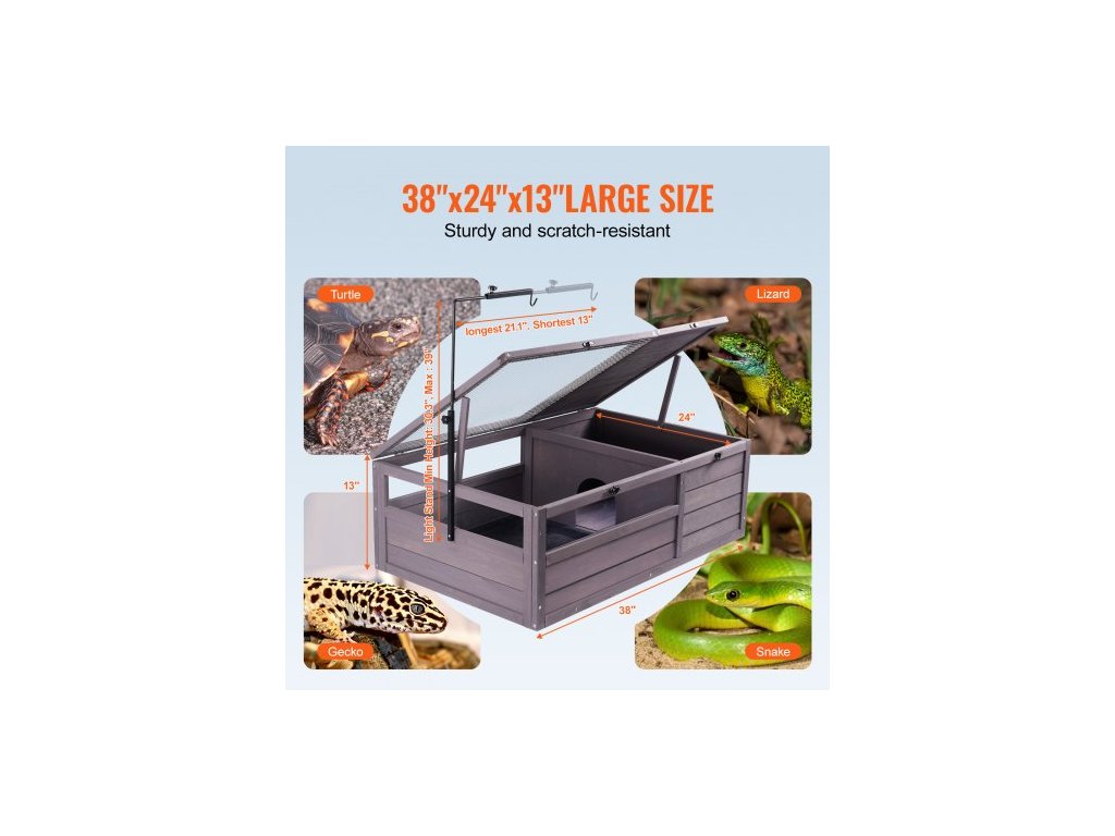 Želví habitat, dřevěný želví domek pro vnitřní i venkovní použití, želví terárium s nastavitelnou objímkou, 2místný terárium pro plazy, malá zvířata, klec pro gekona, ještěrku, hada, 38x24x13 palcůKonstrukce z masivního dřeva