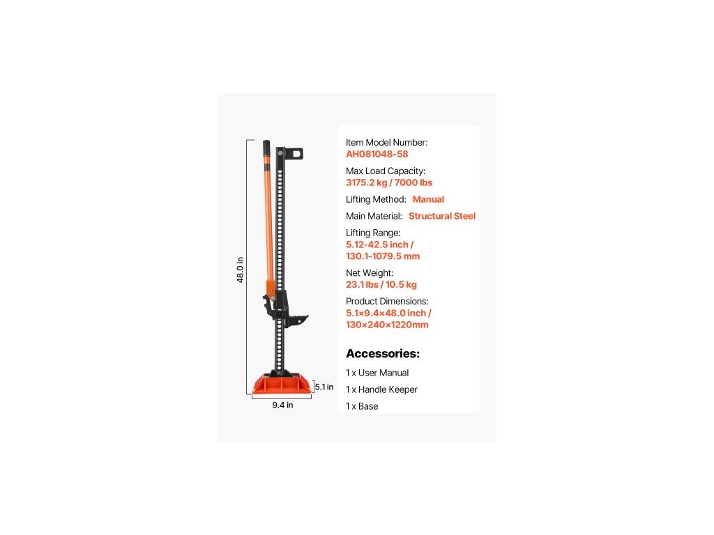 Číslo modelu: AH081048-58,Maximální nosnost: 7000 lbs / 3175,2 kg,Způsob zvedání: Ruční,Rozměry výrobku: 5,1 x 9,4 x 48,0 palců / 130 x 240 x 1220 mm,Čistá hmotnost: 31,7 lbs / 14,4 kg,Hlavní materiál: Konstrukční ocel,Rozsah zdvihu: 5,12–42,5 palce / 130,1–1079,5 mm