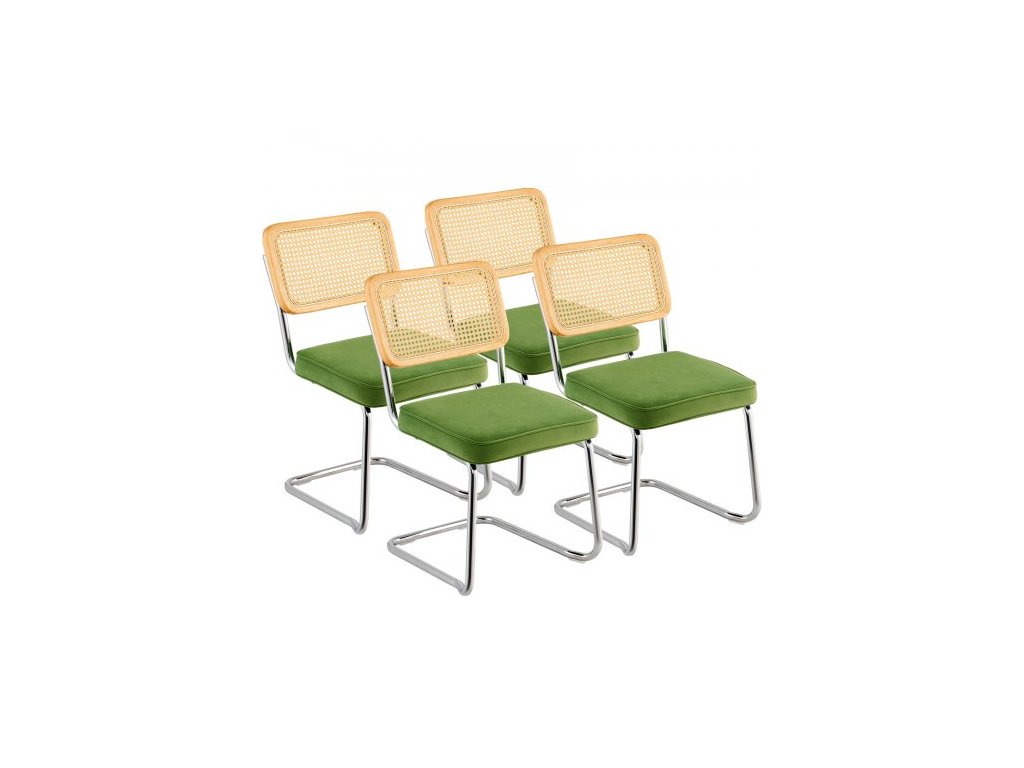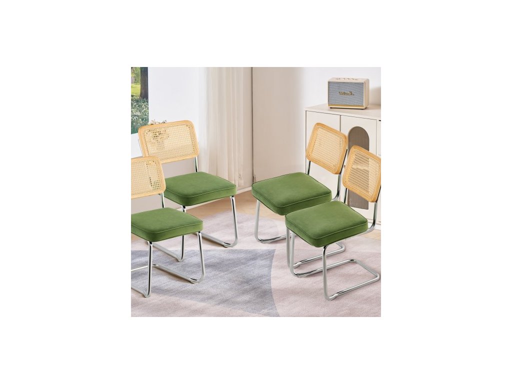 Židle z ratanu, sada 4 kusů, jídelní židle v moderním stylu poloviny století, čalouněná sametová akcentní židle s ratanovým opěradlem, retro jídelní kuchyňská židle do obývacího pokoje, ložnice, čítárny, kanceláře, zelená