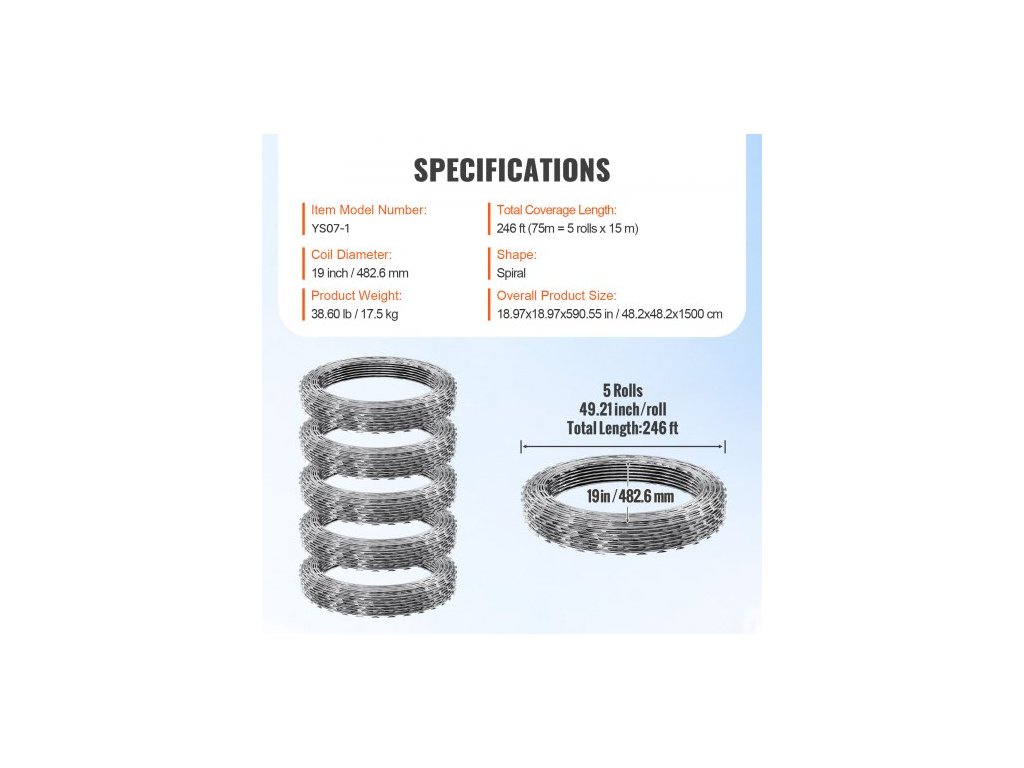 Průměr cívky: 19 palců/482,6 mm,Tvar: Spirálový,Celková délka pokrytí: 246 stop (75 m = 5 rolí x 15 m),Celkové rozměry výrobku: 18,97x18,97x590,55 palce/48,2x48,2x1500 cm,Číslo modelu položky: SD-SRBW17.5-BTO22,Hmotnost výrobku: 38,60 lb/17,5 kg