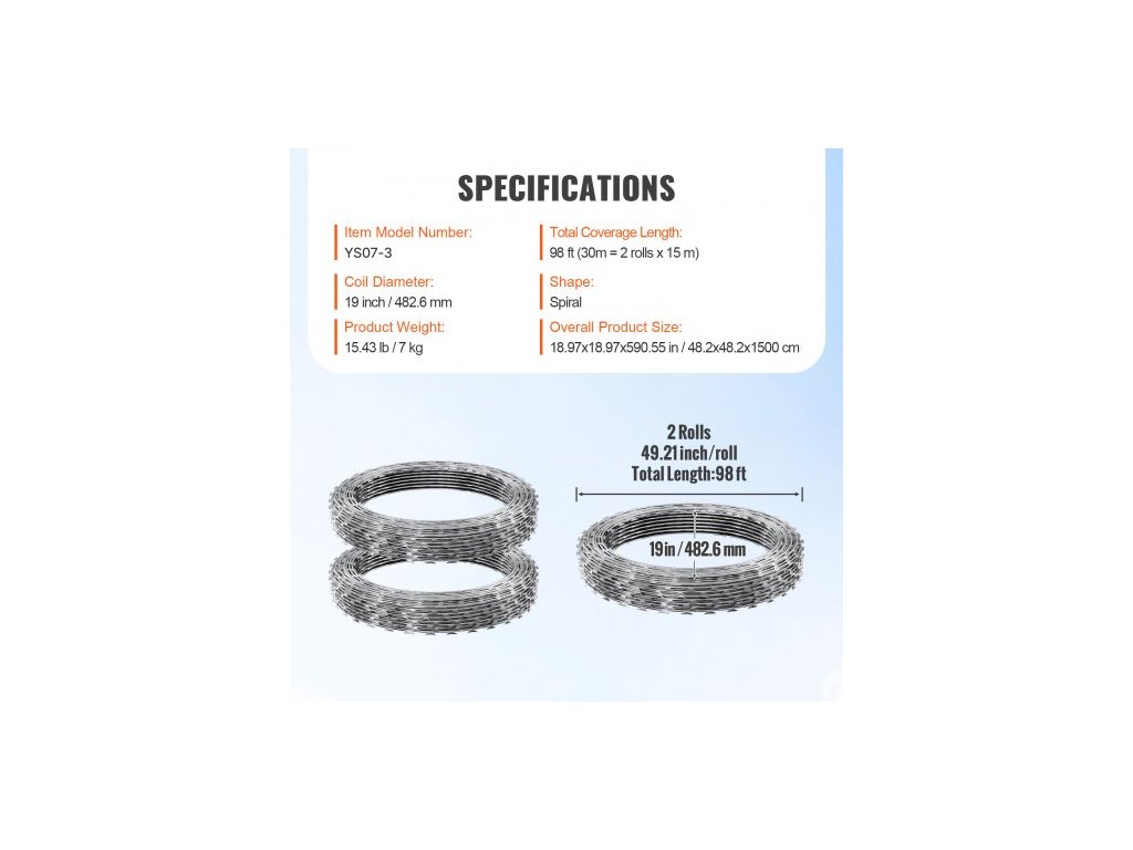 Průměr cívky: 19 palců/482,6 mm,Tvar: Spirálový,Celková délka pokrytí: 98 stop (30 m = 2 role x 15 m),Celkové rozměry výrobku: 18,97 x 18,97 x 590,55 palce/48,2 x 48,2 x 1500 cm,Číslo modelu položky: SD-SRBW7.5-BTO22,Hmotnost výrobku: 15,43 lb/7 kg