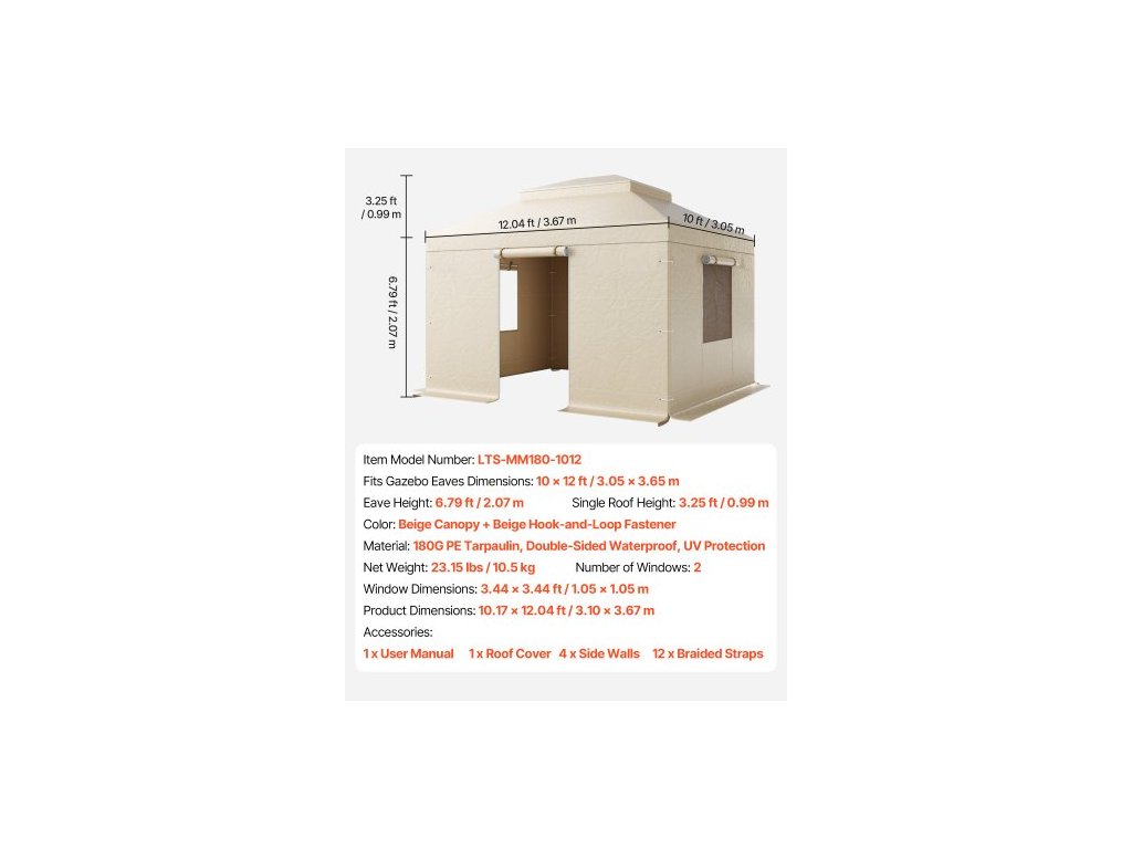 Výška okapu: 6,79 stop / 2,07 m, Rozměry okapu vhodné pro altány: 10 × 12 stop / 3,05 × 3,65 m, Barva: Béžová stříška + béžový suchý zip, Číslo modelu položky: LTS-MM180-1012, Materiál: plachta z PE 180G, oboustranně vodotěsná, UV ochrana, Rozměry okna: 3,44 × 3,44 stopy / 1,05 × 1,05 m,Počet oken: 2,Rozměry výrobku: 10,17 × 12,04 stopy / 3,10 × 3,67 m,Výška jednoduché střechy: 3,25 stopy / 0,99 m,Čistá hmotnost: 23,15 liber / 10,5 kg
