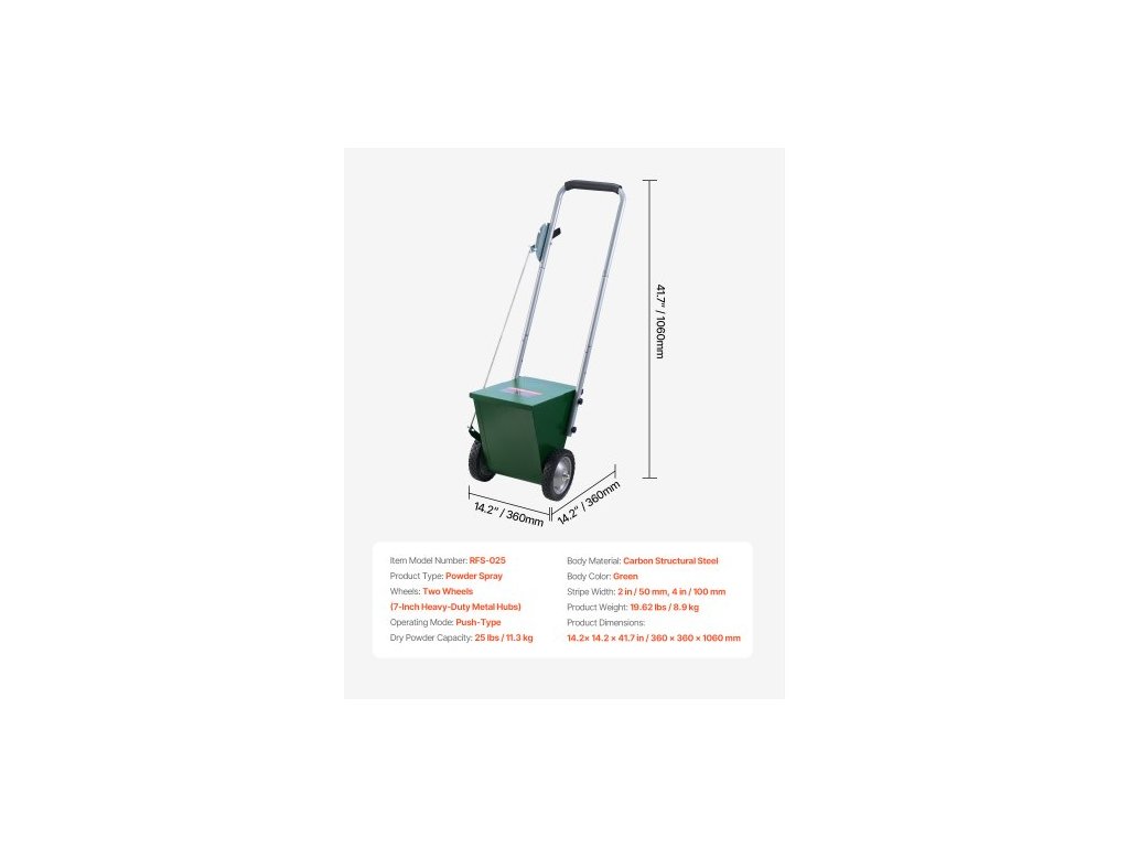Materiál těla: Uhlíková konstrukční ocel,Typ produktu: Práškové stříkání,Kolečka: Dvě kolečka (7palcové odolné kovové náboje),Barva těla: Zelená,Číslo modelu položky: RFS-025,Hmotnost produktu: 8,9 kg,Provozní režim: Tlačný typ,Rozměry produktu (D x Š x V): 360 x 360 x 370 mm,Šířka pruhu: 5 cm 50 mm, 4 palce / 100 mm, kapacita suchého prášku: 25 liber / 11,3 kg